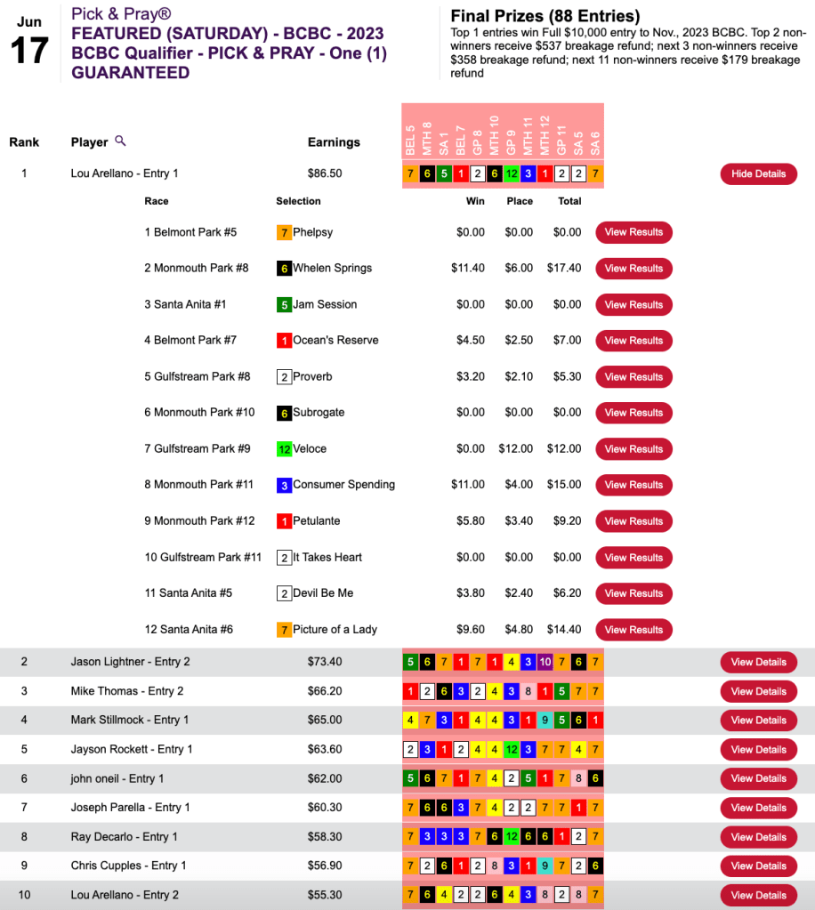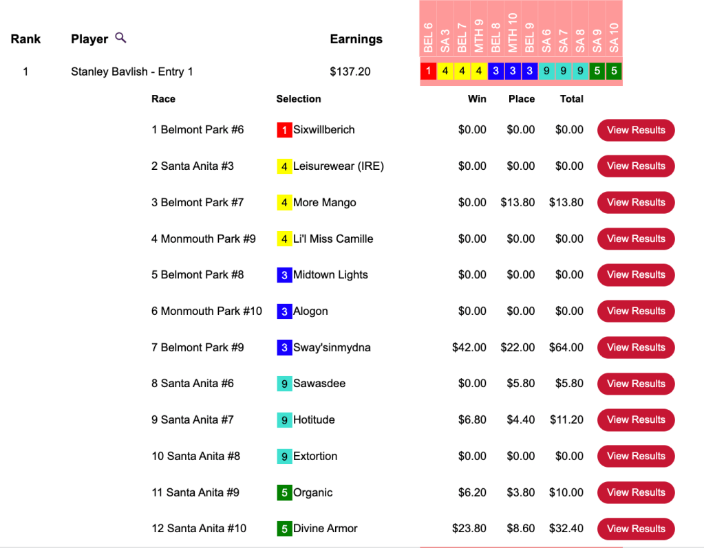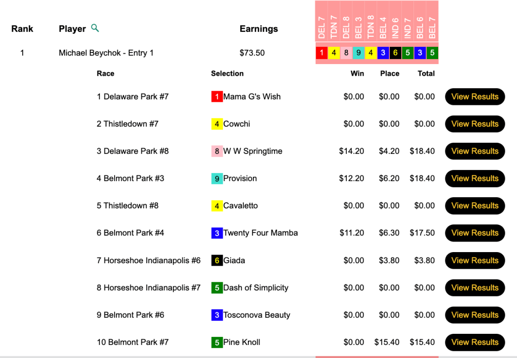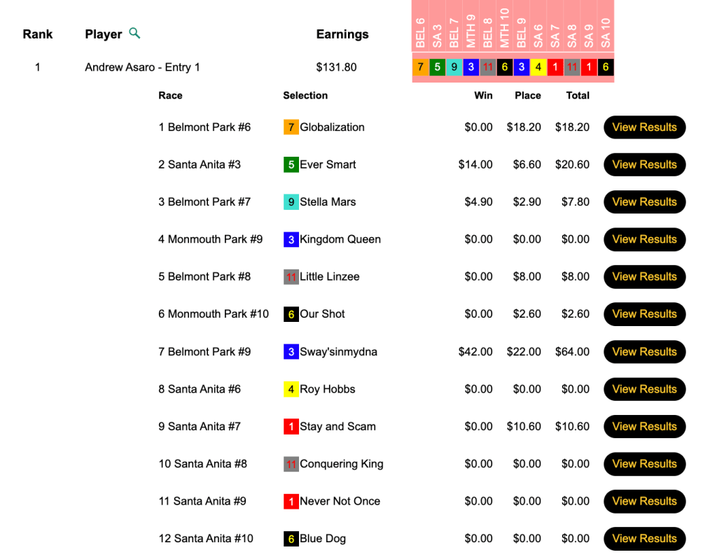 The first two went to Michael “The Coach” Goodrich (4 wins, 2 places)—who got the job done despite not having Sway’sinmydna—and Jerry McClenin (3W, 2P).