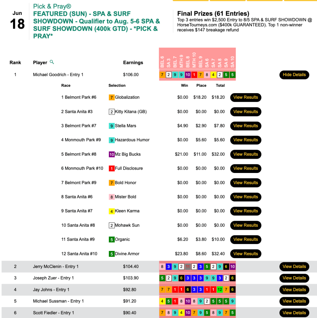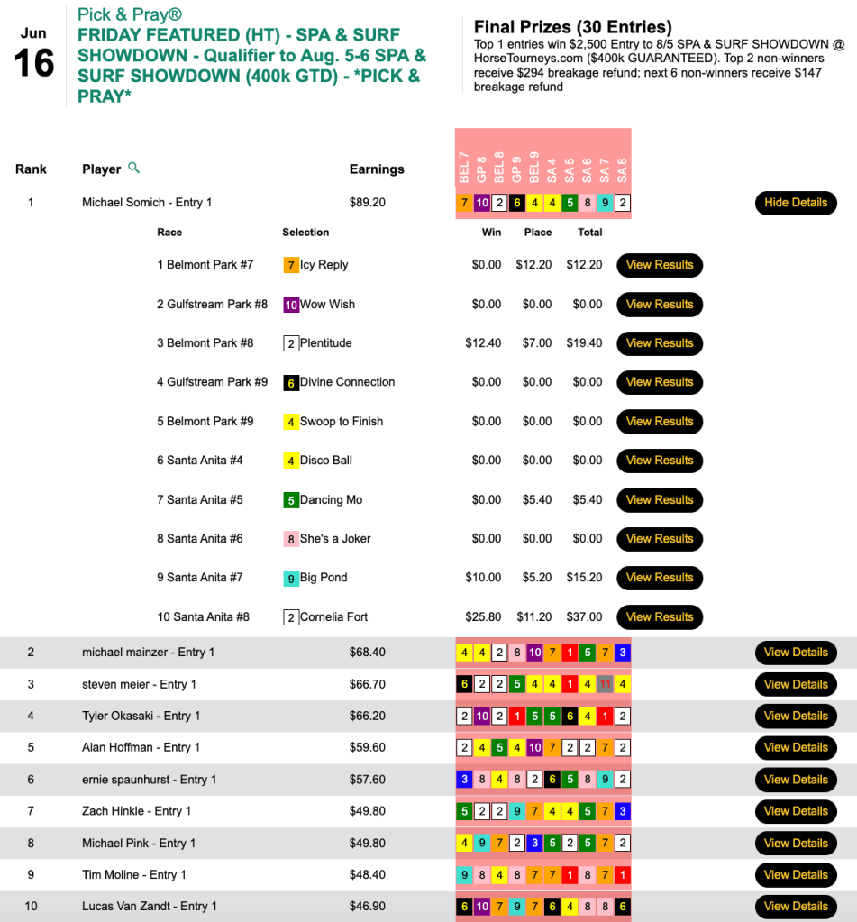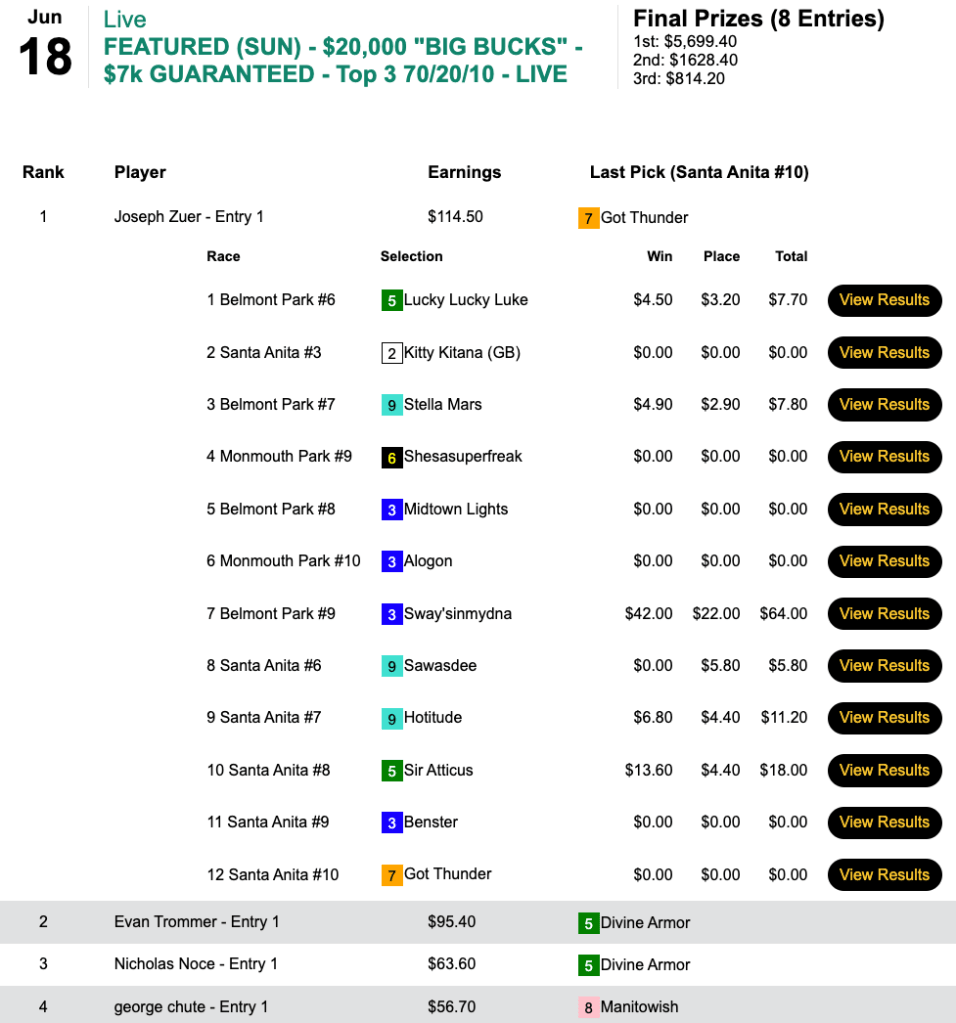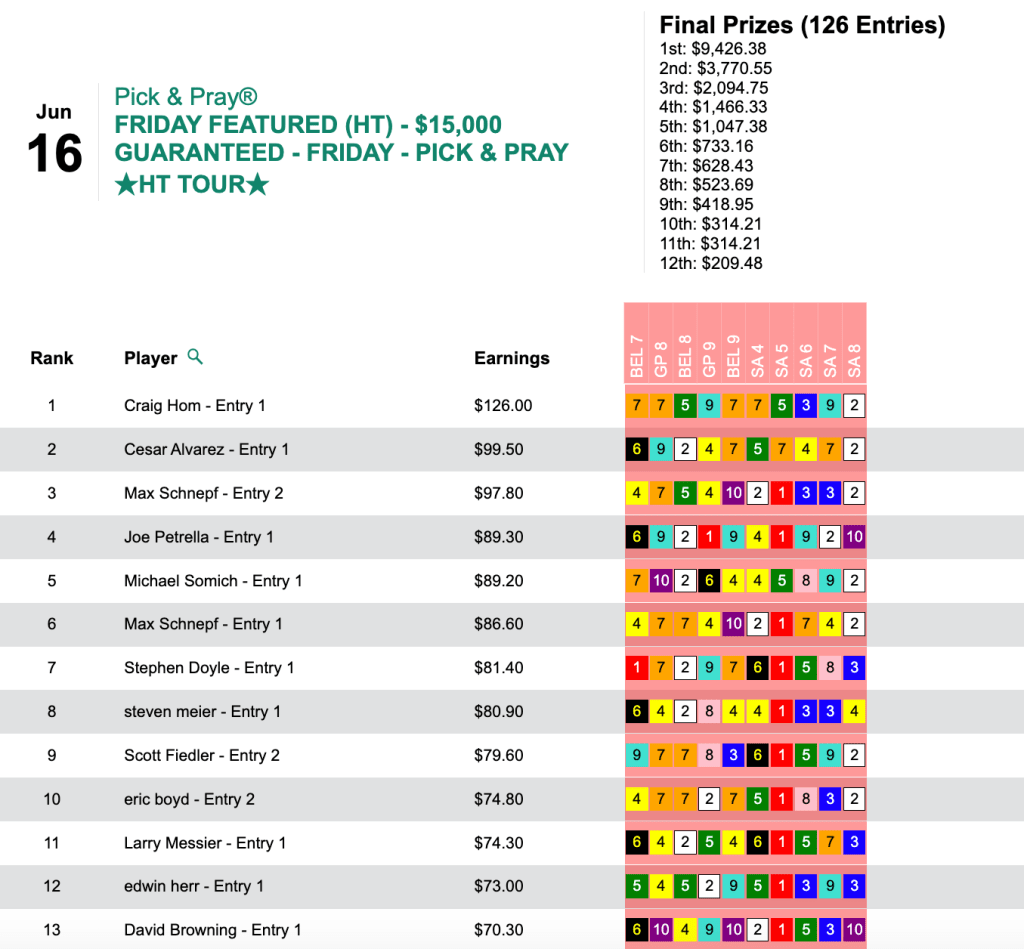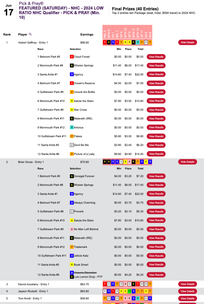 As noted earlier, Saturday wasn’t a great day for longshots, but Gaffney managed to smoke out 7 winners, including the day’s two biggest, and he emerged victorious in Saturday’s HT Tour event, our $30,000 Guaranteed Pick & Pray. Gaffney’s winner’s share came to $13,721.