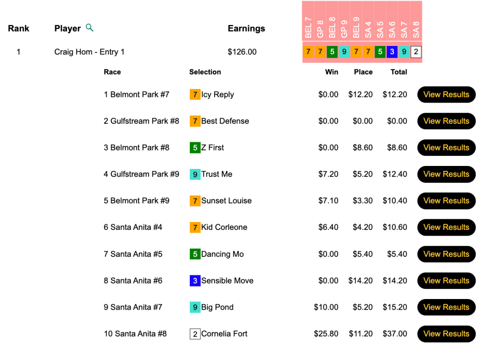 Returning to Friday featured-tourney competition, Craig “Home Sweet” Hom found himself trailing by 30 cents heading into the last race of our $15,000 Guaranteed Pick & Pray, so perhaps his locked-in selection of an 11-1 shot didn’t seem optimal to him at the time…but he sure liked it afterwards.
