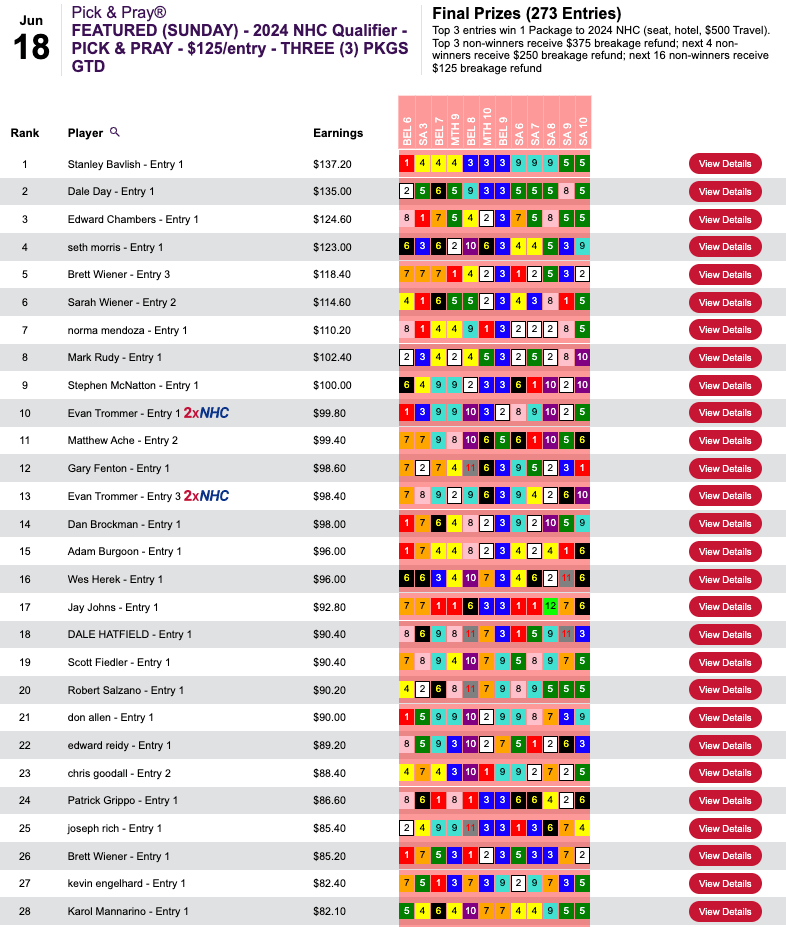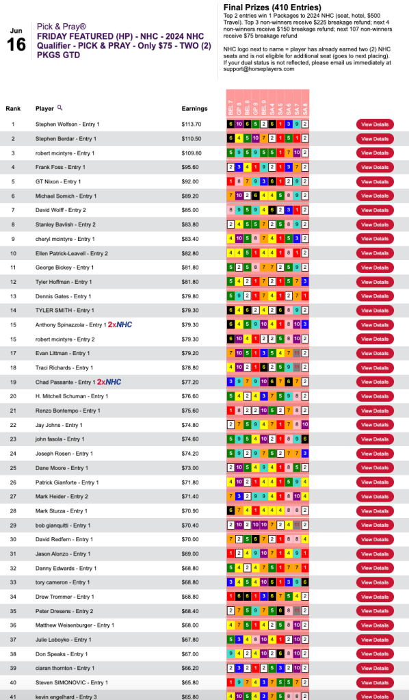 Bavlish (4 wins, 2 places) put up Sunday’s highest score in capturing Sunday’s $125 NHC qualifier at HorsePlayers. This event guaranteed three spots, and the other two went to Dale Day (4W, 0P), who reached the NHC final table in 2022, and Edward Chambers, whose 4 wins (and no places) all came over the final seven tourney races. The scorecards of all three were led by Sway’sinmydna ($67.50, $22.80) in the 9th at Belmont.