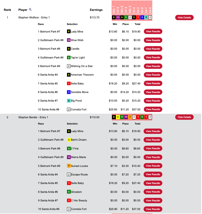 This victory left the 2012 NHC champ about $996,000 short of his next million…but we’re sure Beychok (3 firsts, 2 seconds) will take it. He caught a $15.40 place collection on a 16-1 shot in the final contest race to edge Michael Sussman by $1.70 in a game that was ultimately worth a total of $8,087.