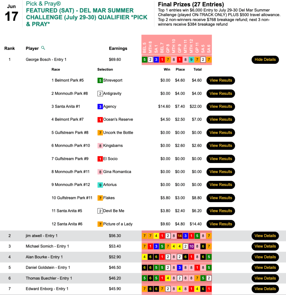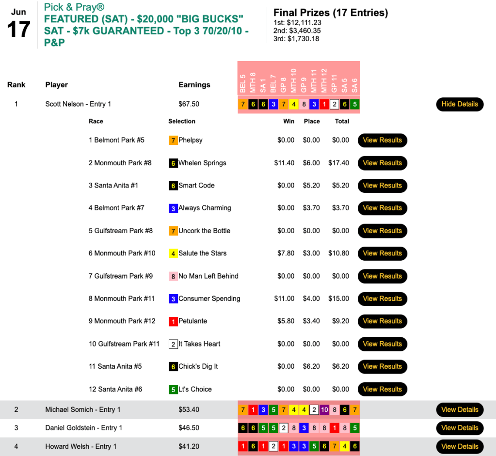 Saturday wasn’t a high-scoring day. The day’s top win price was $14.60, and there were only three double-digit winners…but Nelson found two of them. He had 4 firsts and 3 seconds in all, and that got him a sizable payday of $12,111 in Saturday’s $10,000 Guaranteed Pick & Pray, which paid out a total of $17,301. Combining his Wednesday and Saturday triumphs, Nelson pocketed $14,910.