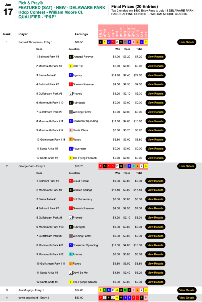 Samuel Thompson (6 wins, 1 place) and George Carr (6W, 0P) were the two winners of $500 entries in Saturday’s qualifier to the July 15 William Moore Classic at Delaware Park.