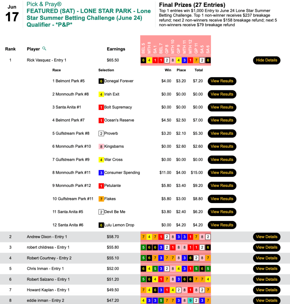Vasquez put up 7 winners and 2 runners up to walk off with a $1,000 seat to this Saturday’s Lone Star Summer Betting Challenge.