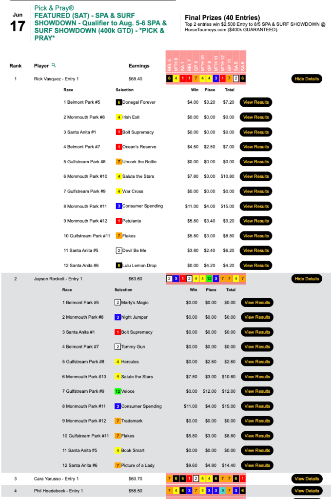 Vasquez got a $2,500 Showdown entry here as did runner up Jayson “Radio City” Rockett, whose $63.40 score was built on 4 firsts and 2 seconds.