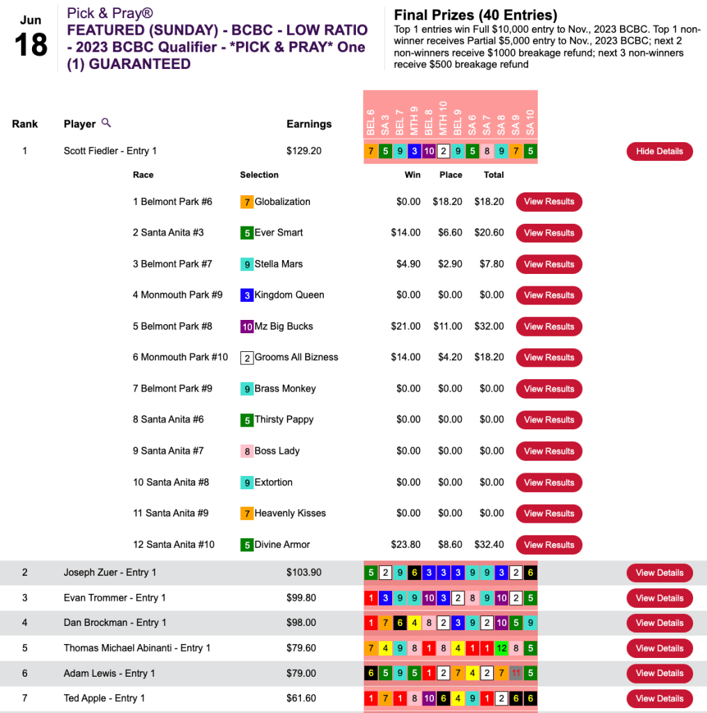 In Sunday’s Breeders’ Cup Betting Challenge Low Ratio play-in at HorsePlayers, Zuer got a $5,000 partial entry for running second to 2020 Spa & Surf Showdown champ Scott Fiedler (5 winners and 1 double-digit runner up). Like Michael Goodrich, Fiedler missed out on Sway’sinmydna but didn’t miss on Divine Armor ($23.80, $8.60) in the final contest race, the 10th at Santa Anita.