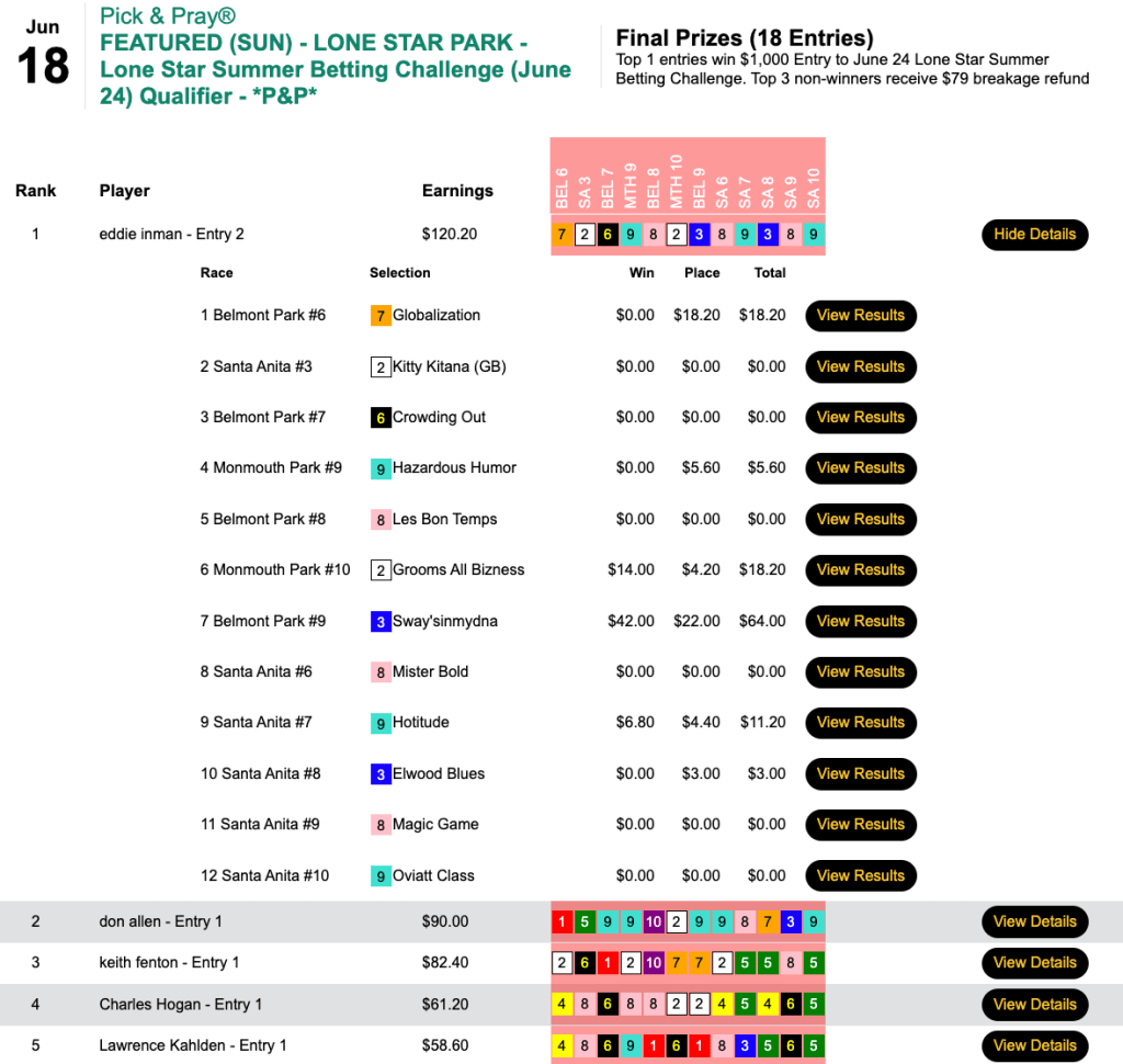Inman added three place returns to the three winners on his scoresheet, and he came away with the $1,000 seat in Sunday’s Lone Star Summer Betting Challenge qualifier.