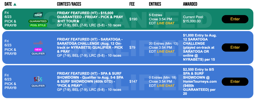 On each day of the weekend, you can attempt to qualify not just for the Saratoga Challenge, but also for the August 5-6 Spa & Surf Showdown here at HorseTourneys. The “Showdown” is the $400,000 Guaranteed final leg of the 2023 Tourney Triple. The barrier to entry on Friday (and Saturday and Sunday as well) is $147, with one of every 20 participants securing a $2,500 place in the lucrative, all-cash tourney that requires participants to play all the races at Saratoga and Del Mar on the first weekend of August. The format for Friday’s qualifier is Pick & Pray.