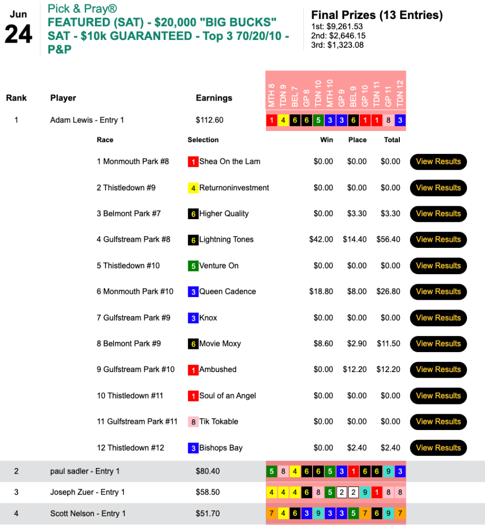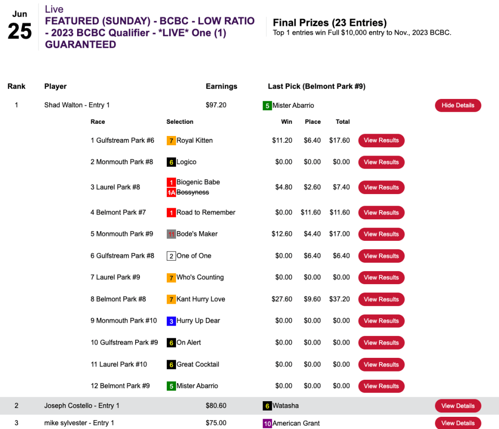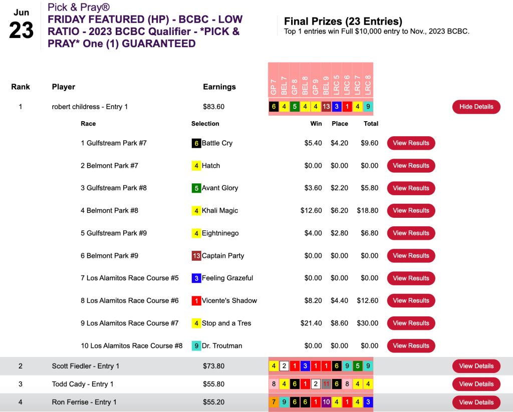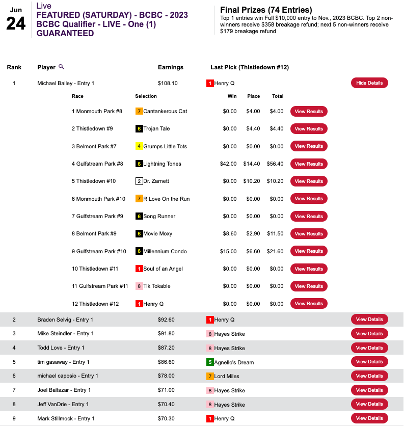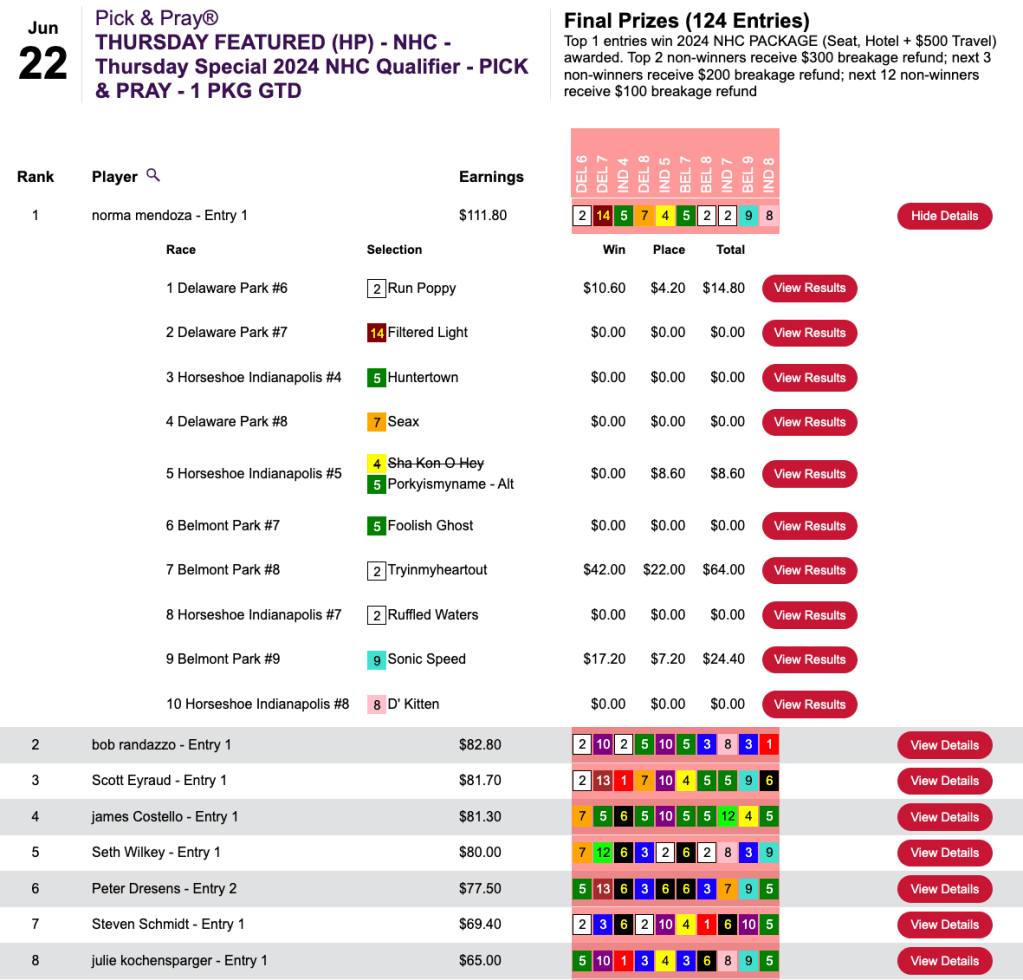 The Mendoza Line was $111.80, but in this case, that was a very high bar. Congratulations to Norma Mendoza, who had Tryinmyheartout plus two other winners and one runner up to punch her ticket to the 2024 NHC.