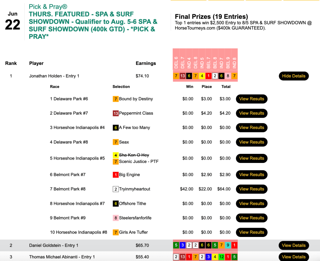 There were enough entries in this one to award three NHC seats, and the last of the three went to Howard “28 Flavors” Johnson, who picked 6 winners. He, Stovall and Fallica all had Khali Magic ($12.60, $6.20) in the 8th at Belmont.