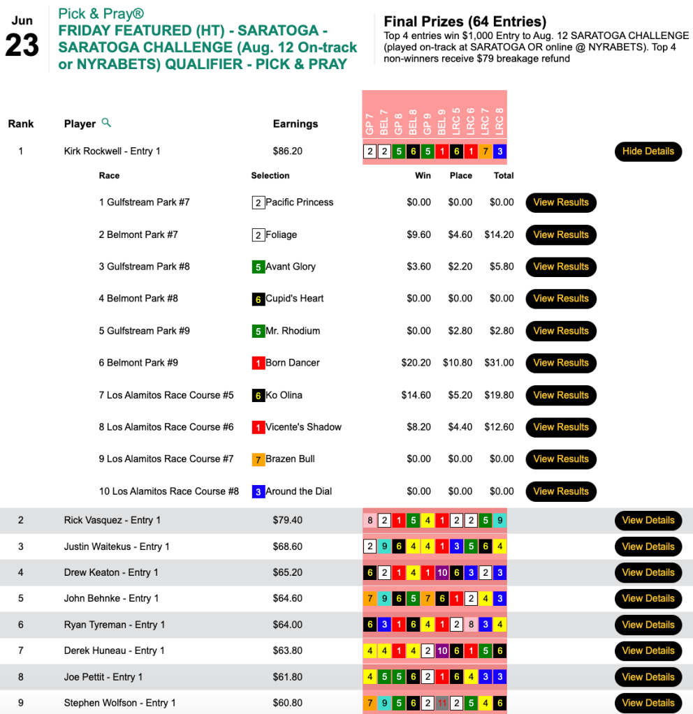 Kirk Rockwell led the way in Friday’s Saratoga Challenge qualifier. His 5 firsts and 1 second were topped by Born Dancer ($20.20, $10.80) in the 9th at Belmont. Also winning entries for August 12th were Rick Vasquez, Justin Waitekus and Drew Keaton.