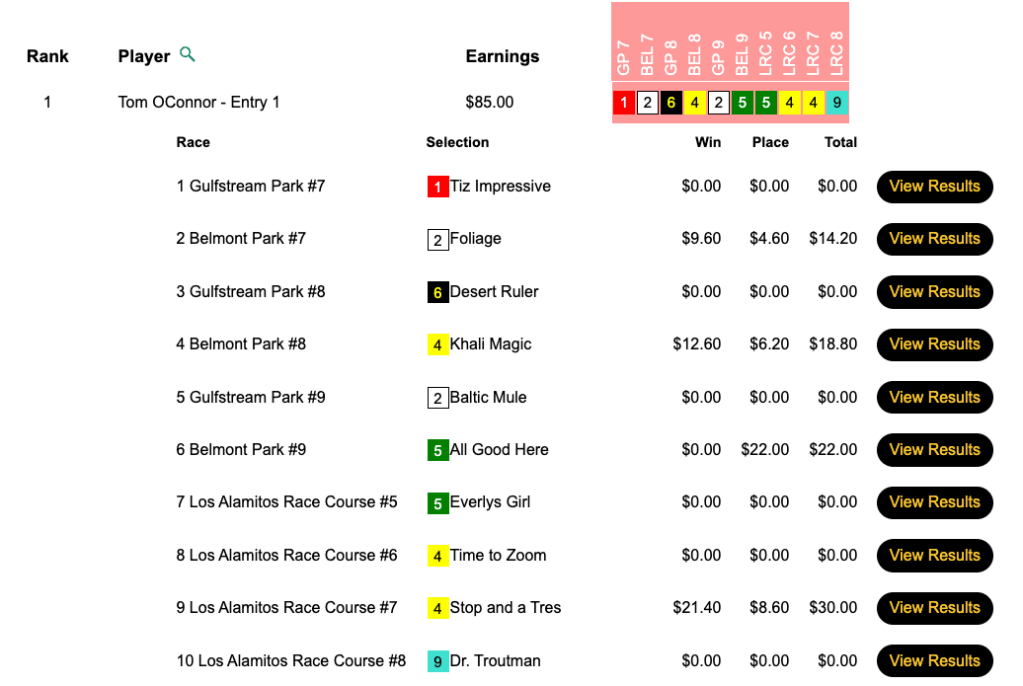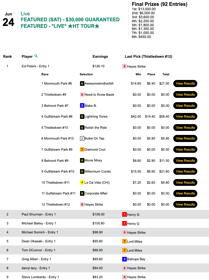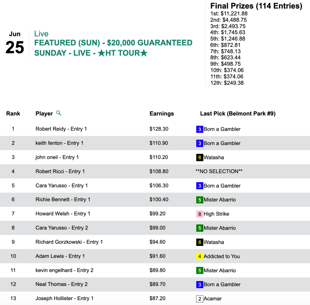 O’Connor selected 3 winners and 1 runner up to capture Friday’s HT Tour event, our $15,000 Guaranteed Pick & Pray, which finished up with a pot $17,788. O’Connor’s share of that was $8,004.
