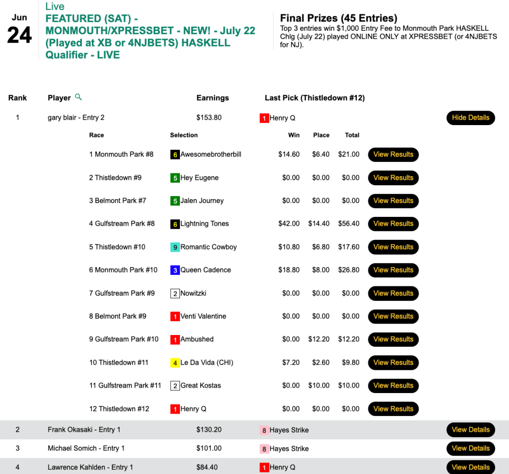 In all, Blair came up with 5 wins and 2 places, and he posted the day’s highest score in taking Saturday’s Haskell Challenge qualifier. Also winning $1,000 berths in this one were the other two to reach the century mark—Frank Okasaki (4W, 1P) and Michael Somich (3W, 2P).