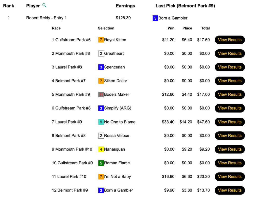 Jayson “Radio City” Rockett (2 firsts, 2 seconds) took home the $6,411 grand prize here. He didn’t have No One to Blame, though. In fact, his top collection came via a $22.00 max place payoff on a 60-1 runner up in race 9 at Laurel.