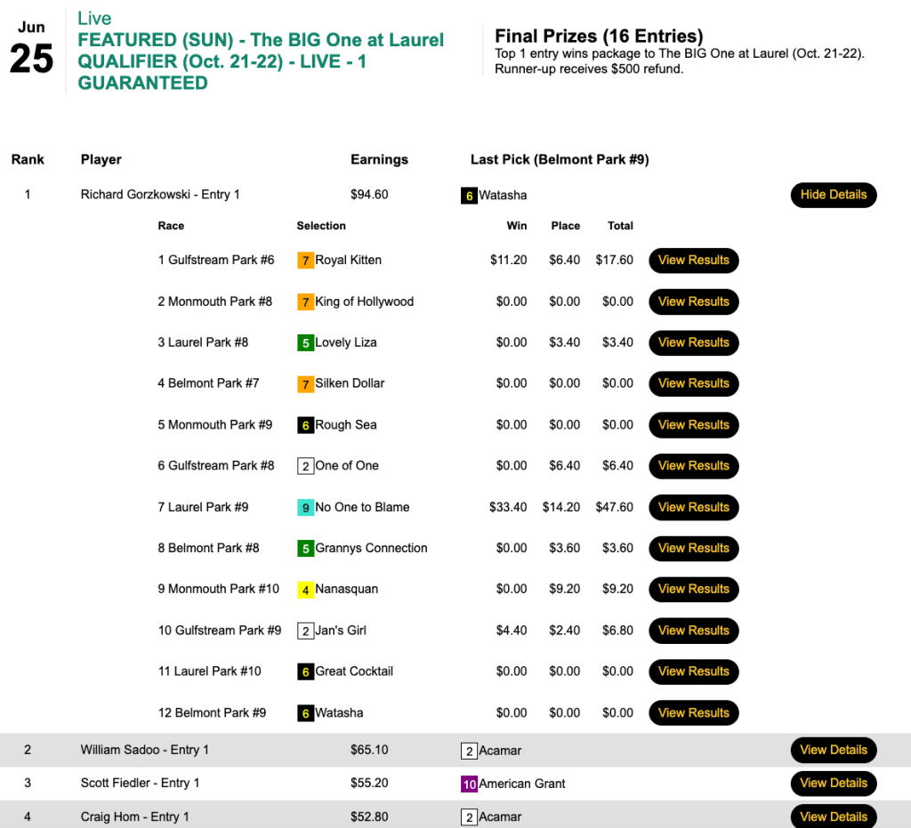 The seven collections made Gorzkowski the winner of our guaranteed qualifier to the Oct. 21-22 The BIG One at Laurel Park. Gorzkowski’s package to The BIG One (where he will be in a field of no more than 57 playing just one entry each) includes hotel, a welcome party, full food and open bar amenities on track and a $500 winner’s bonus.