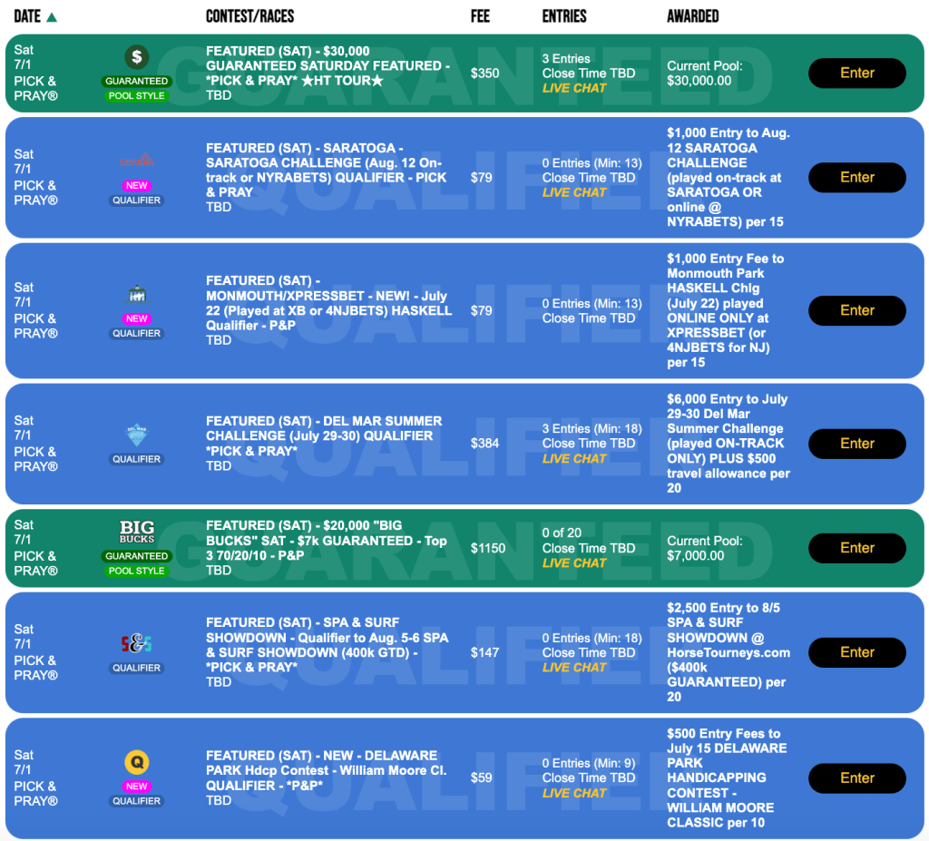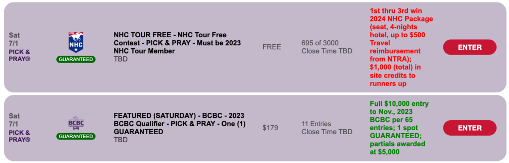 There are nine featured tourneys (all Pick & Prays) on Saturday, and we’ll lead with the two at HorsePlayers—since that is the site of the free NHC qualifier.