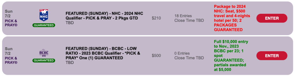 The Sunday NHC qualifier, another Pick & Pray, guarantees two seats and carries an entry fee of $210. The winning ratio works out to 1-per-50.