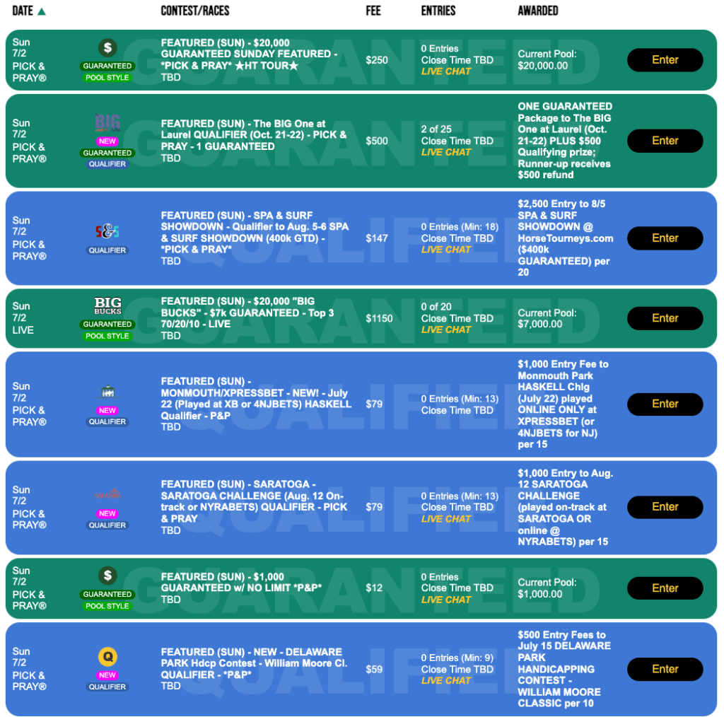 As promised earlier, we’ll have Pick & Pray qualifiers to the Spa & Surf Showdown , the Haskell Challenge, the Saratoga Challenge and the William Moore Classic at Delaware. The same entry fees and winning ratios in place for Friday apply here as well.