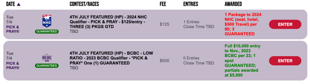 Seven featured events—all presumably familiar to you by this point…and all very much worth winning. Enjoy your weekend leading up to Independence Day. We’ll be back in this space on Monday to recap the Friday-Saturday-Sunday goings on. In the meantime, good luck!