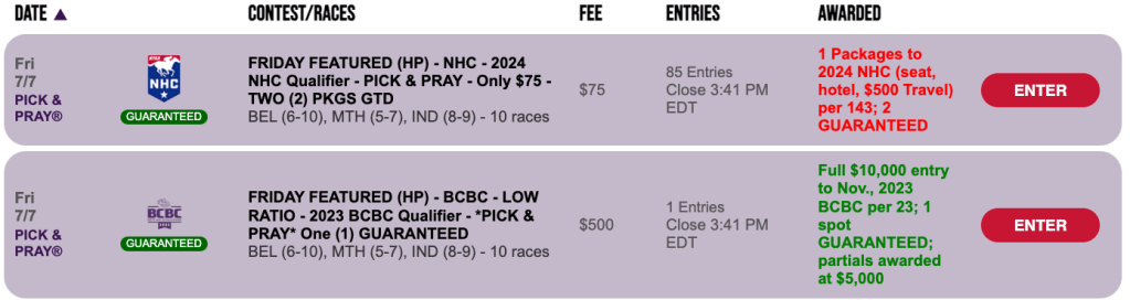 Your chance to qualify on Sunday for the NHC exists here at HorseTourneys, and it’s the only Pick & Pray of the day. It’s another “regular,” 1-per-65 game that guarantees two spots. The entry fee is $165.