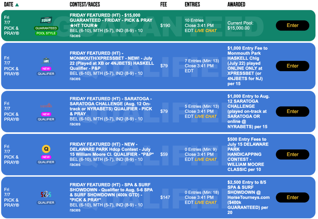 Another constant on this weekend’s schedules are qualifiers to the $400,000 Guaranteed Spa & Surf Showdown, which serves as the final leg of the 2023 Tourney Triple here at HorseTourneys. The qualifier entry fee on Friday (and Saturday and Sunday as well) is $147, with one of every 20 entrants winning a $2,500 spot in the all-cash event that gives participants the happy chore of making a mythical $2 win-and-place selection on every race at Saratoga and Del Mar on August 5-6.