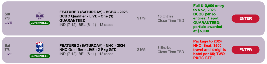 Another guaranteed qualifier on Sunday is that for the October 21-22 The BIG One at Laurel Park, which has an all-cash prize pool in 2024. The winner earns a spot in October’s small-field, big-money contest…plus hotel, welcome party, track transfers and full food and open-bar amenities at the track…plus $500 for your travel. The entry fee is $500, and the runner up gets a $500 consolation refund.