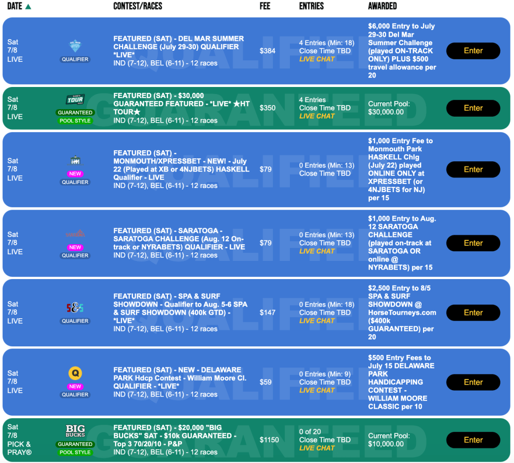As noted earlier, we’ll have qualifiers on Saturday for the Spa & Surf Showdown, the Haskell Challenge, the Saratoga Challenge and the William Moore Classic at Delaware. The same entry fees and winning ratios in place for Friday apply here as well, but unlike Friday’s games, all of these will be Live-format tussles.