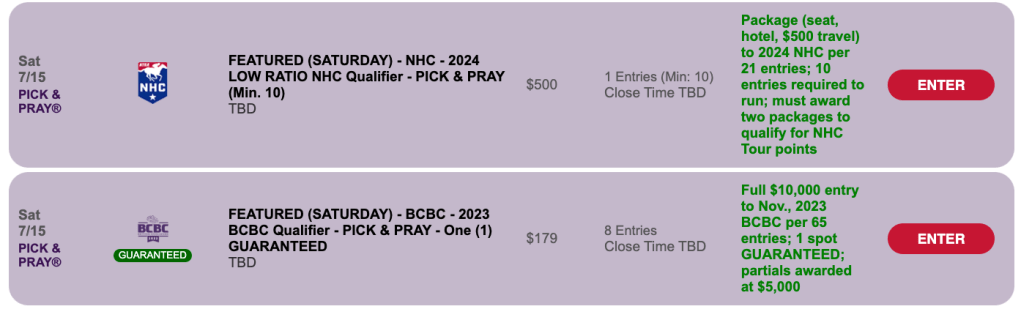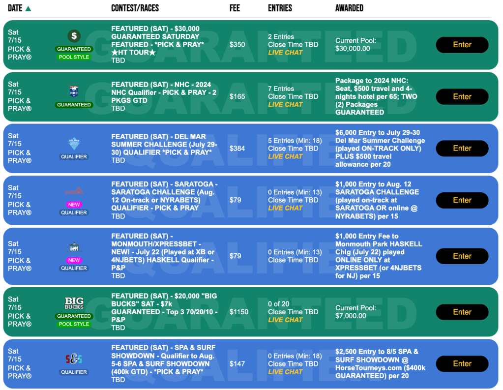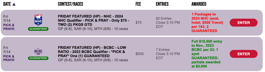 There are two NHC qualifying opportunities on Saturday—one here and one at HorsePlayers. The one here is a “regular,” $165 Pick & Pray with two spots guaranteed. The winning ratio is 1-per-65.