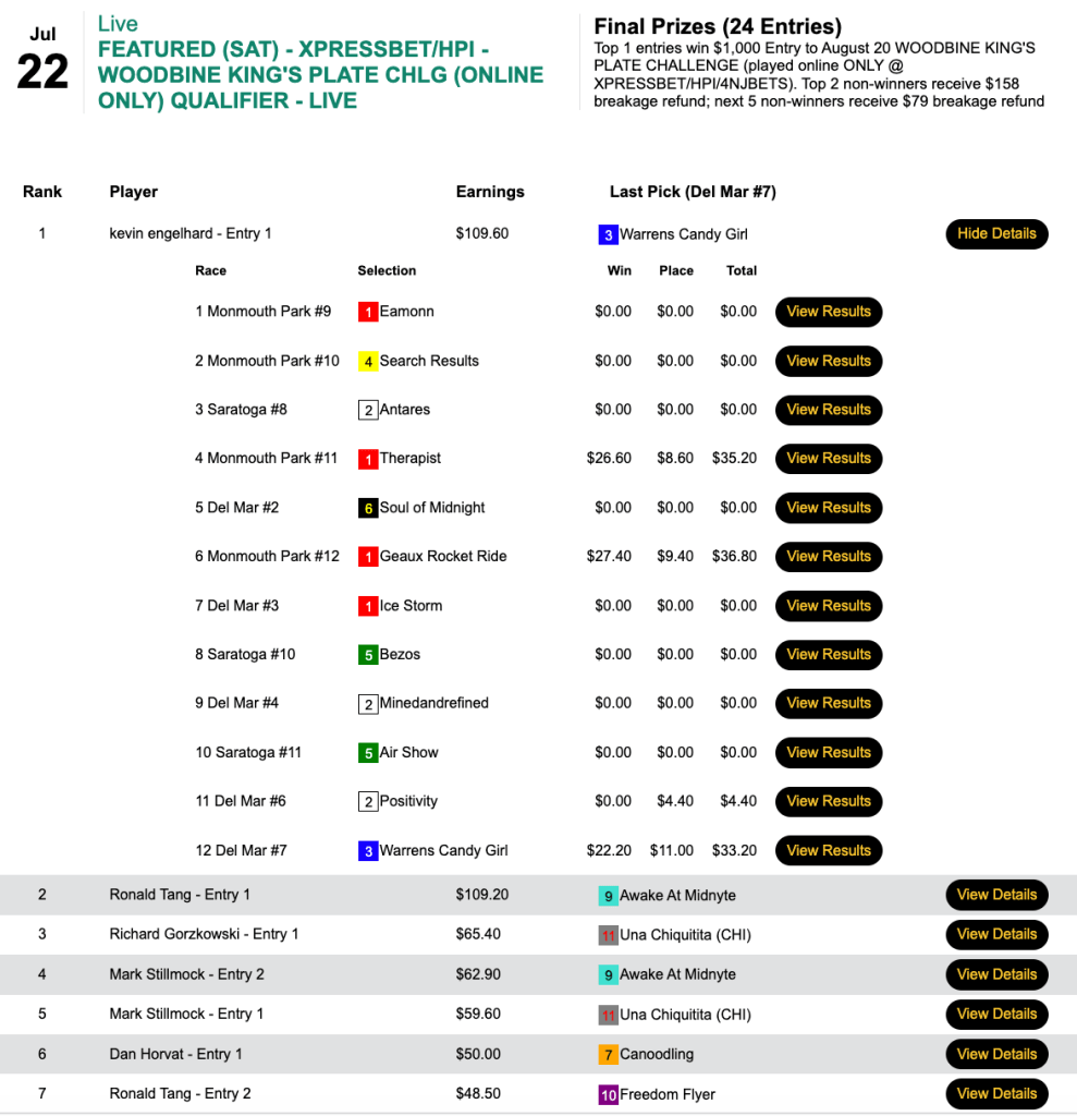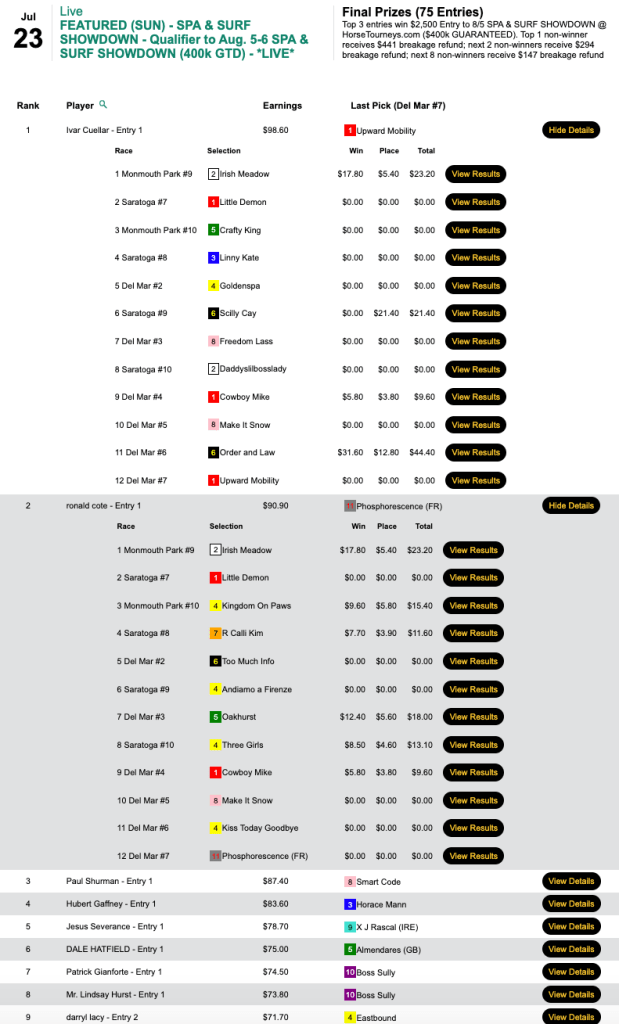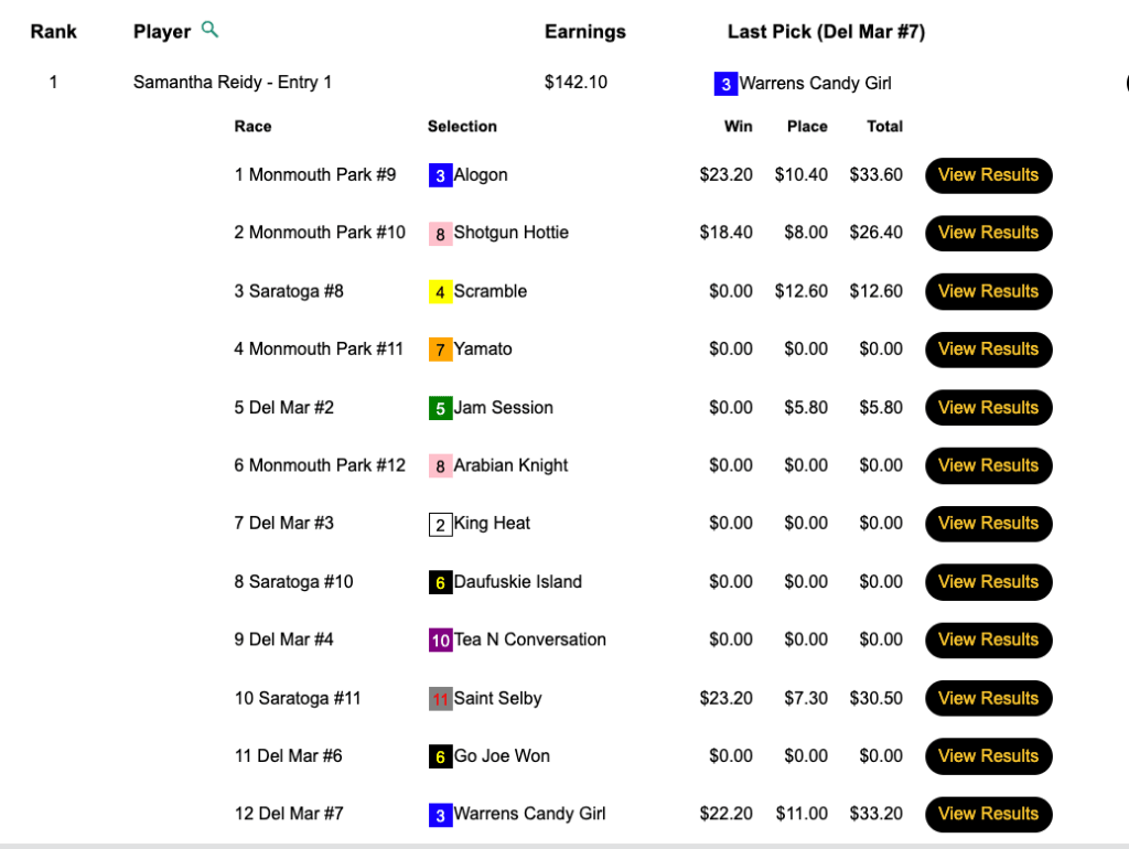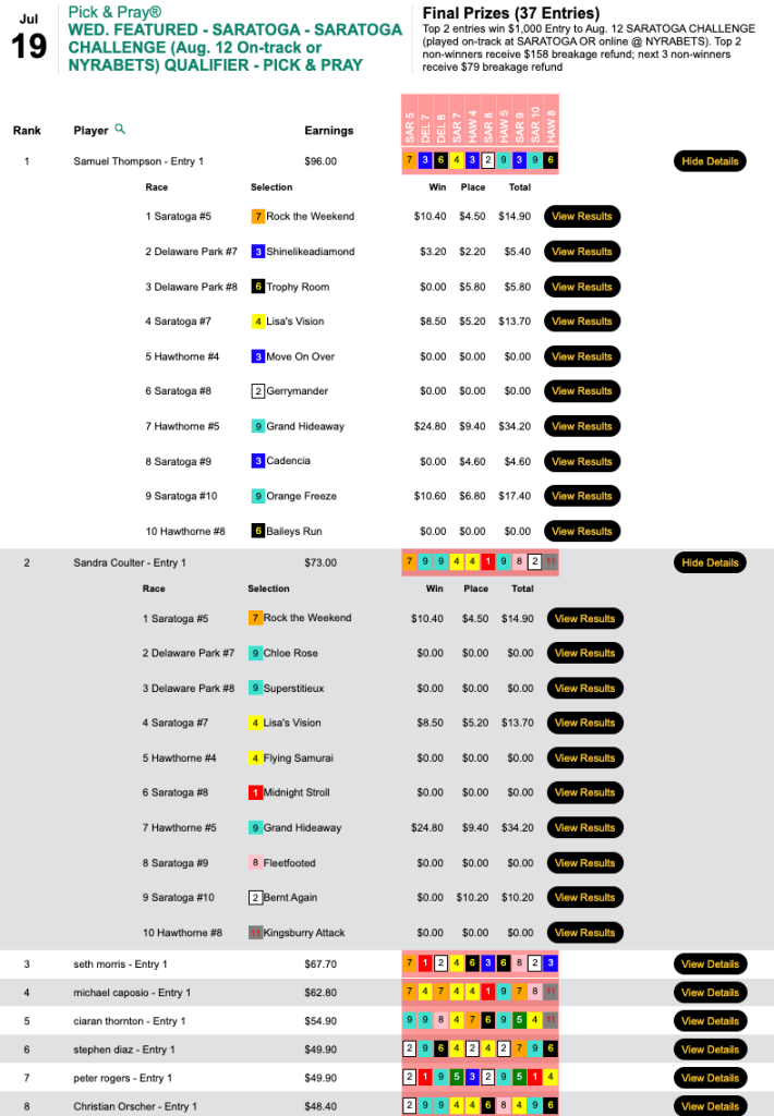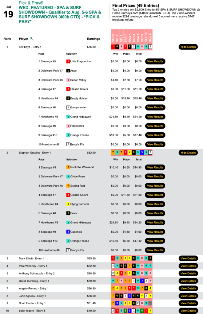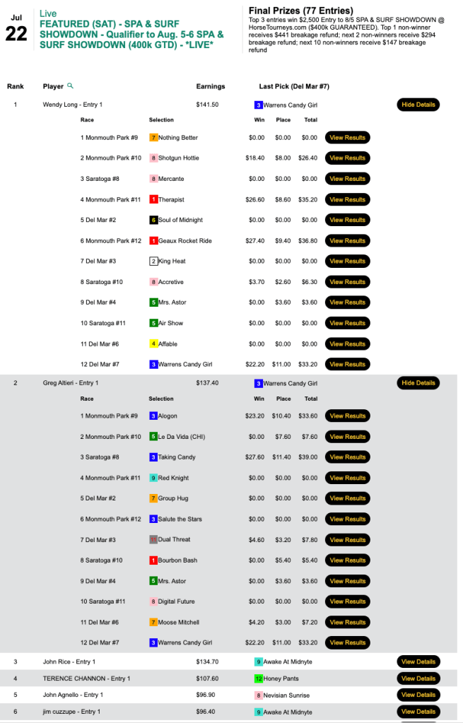 Ho-hum. Another day, another $2,500 Spa & Surf Showdown seat. Long had three $20+ horses in her 5-win, 1-place Saturday portfolio, including Warrens Candy Girl in the contest finale. Also earning $2,500 berths for August 5-6 were Greg Altieri (5W, 3P) and John Rice (3W, 4P, including a pair of $27 winners).