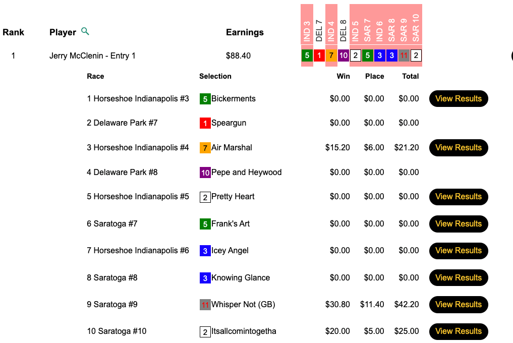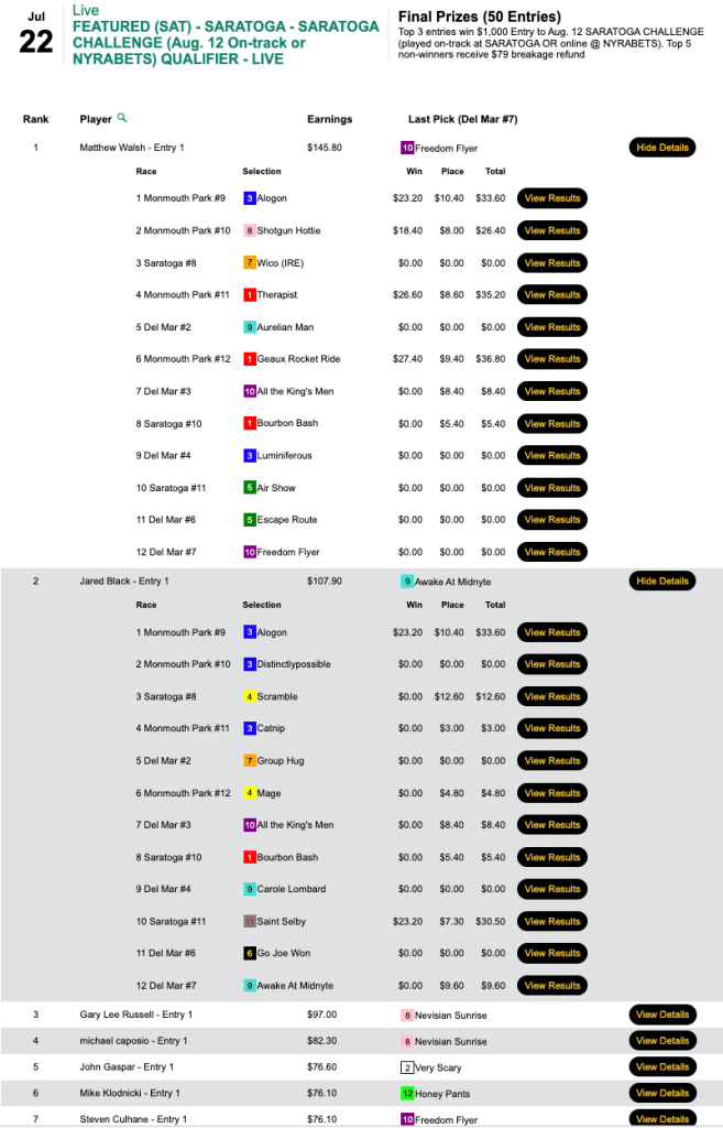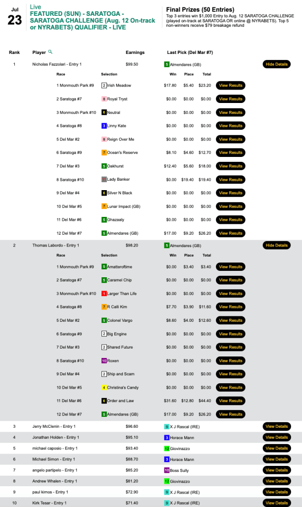 Nick “529” Fazzolari (4 wins, 1 place), Thomas Labordo (also 4W, 1P, including the last 2 winners) and Jerry McClenin (3W, 2P) were Sunday’s three winners in our Saratoga Challenge qualifier.