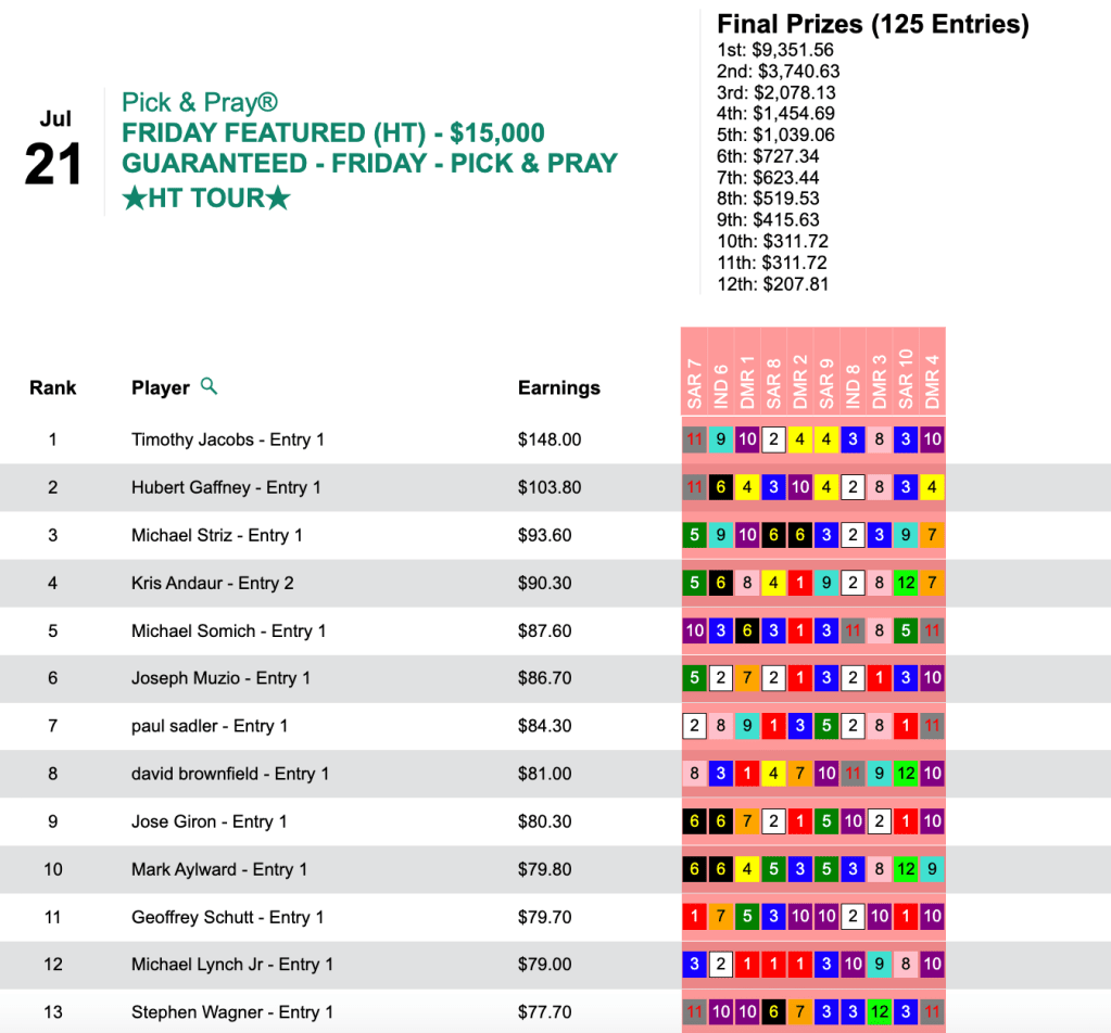 Jacobs (3 firsts, 2 seconds) got the top spot—and the $9,351 that went with it—in Friday’s HT Tour game, our $15,000 Guaranteed Pick & Pray, which wound up paying out a total of $20,781.