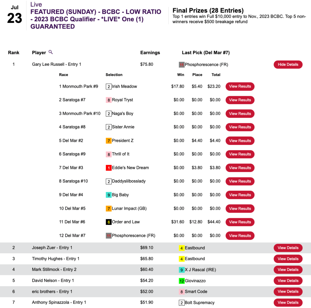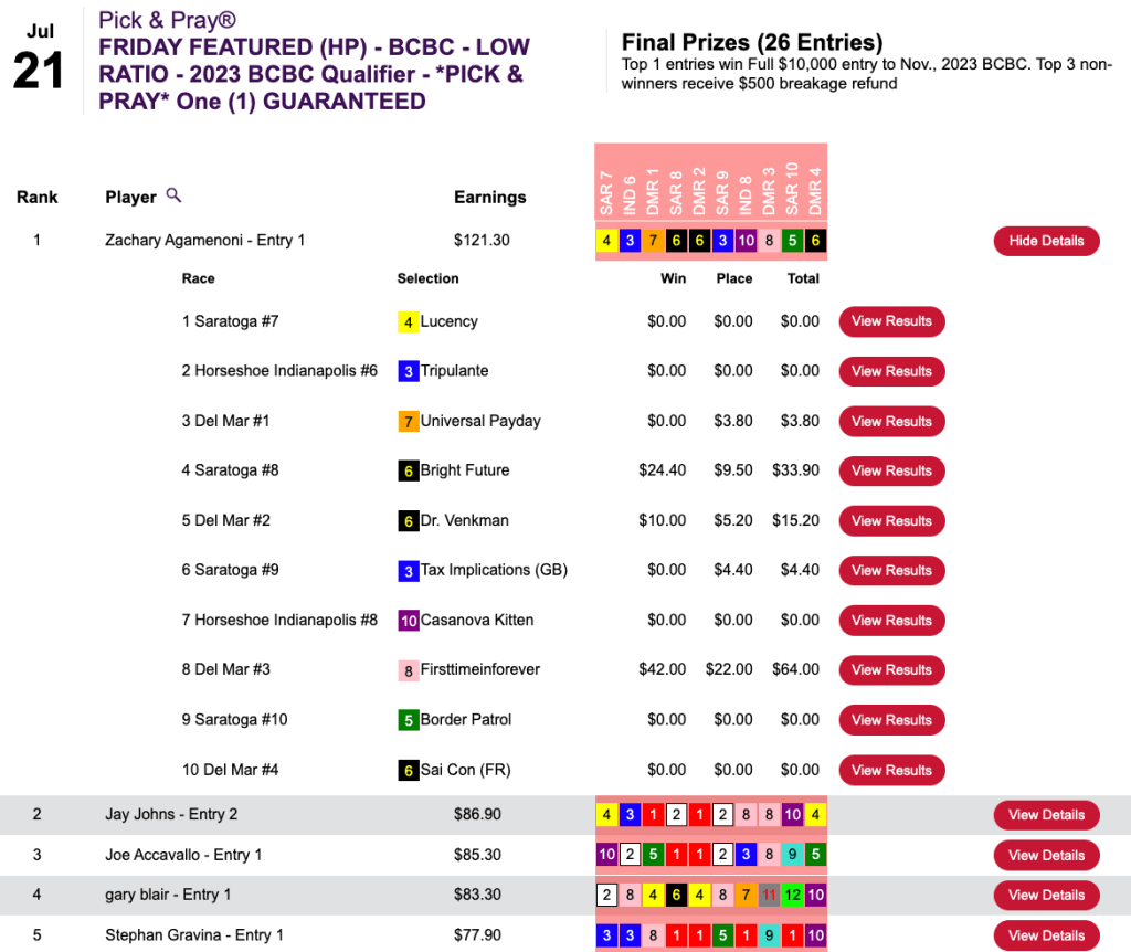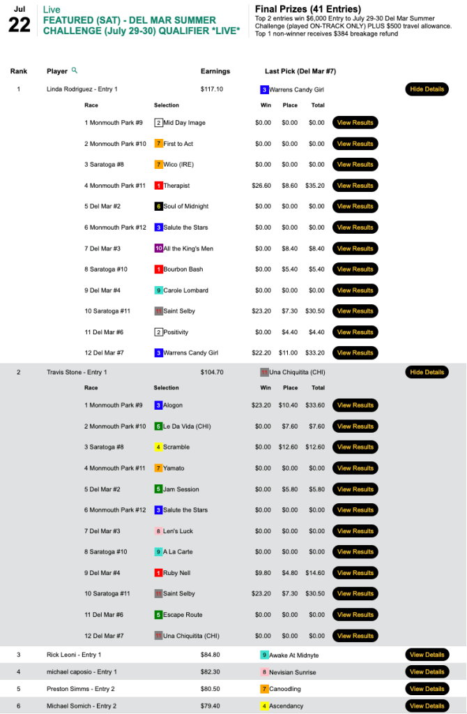 Using the same selections, Caposio bested all but Zachary Agamenoni (4W, 1P), who won this Del Mar Summer Challenge qualifier 48 hours after taking Friday’s BCBC Low Ratio play-in. Caposio and Agamenoni will both be coming into Del Mar hot!