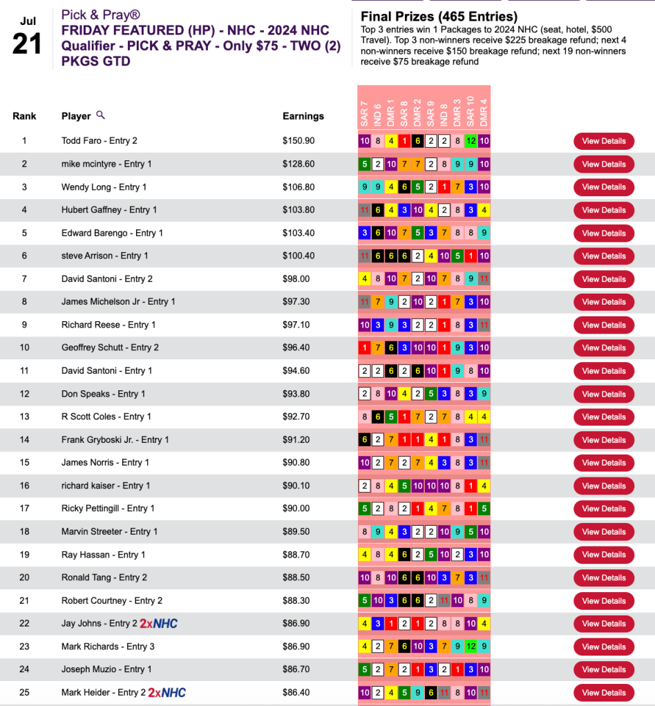 The same picks that got Long her first of two Spa & Surf Showdown entries also landed here an NHC seat in Friday’s $75 qualifier at HorsePlayers.