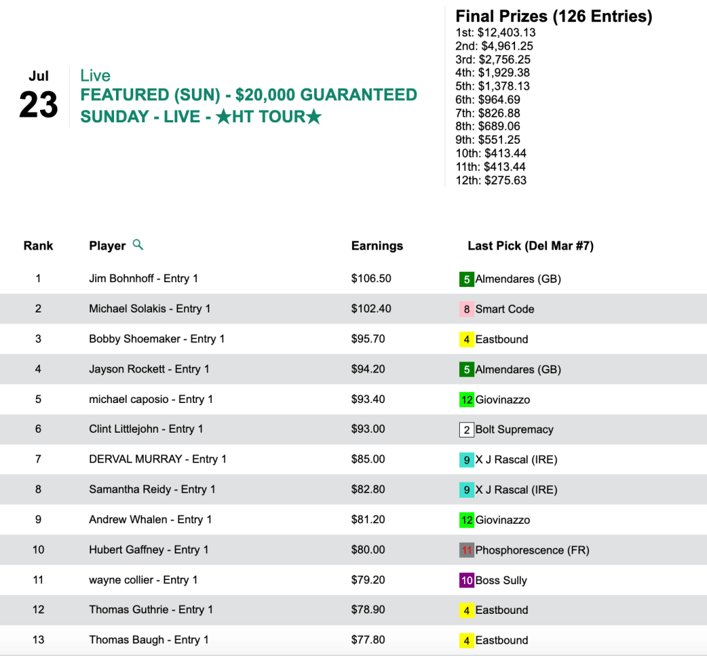 Reidy picked Warrens Candy Girl ($22.20, $11.00) in the final contest race, the 7th at Del Mar, and that one paid just enough to give Reidy the top prize in Saturday’s $30,000 Guaranteed cash game over HT Tour heavy head Mark Stillmock. The total prize pool in this HT Tour game came to $32,648.