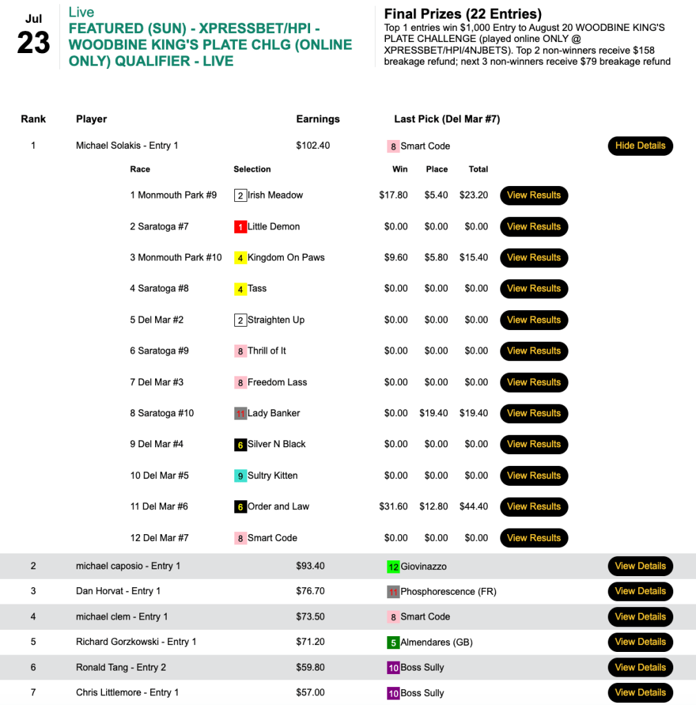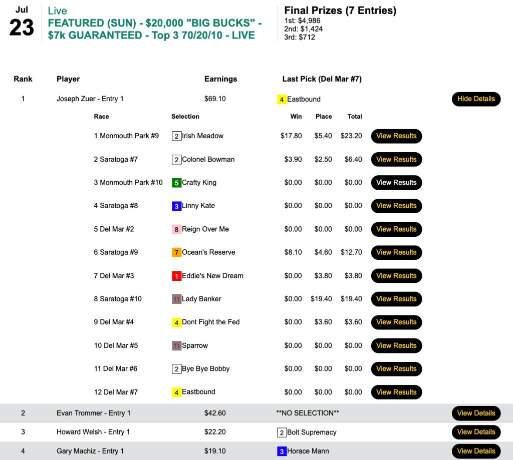 Like Russell, Caposio had 2 wins and 2 places that culminated with Order and Law. The quartet of cashes gave him a $44 victory in Sunday’s Guaranteed qualifier to The BIG One.