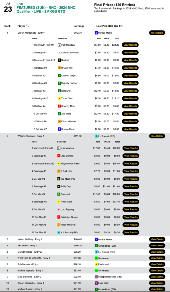 They were the two seat winners in Sunday’s $165 NHC qualifier here at HorseTourneys. For Maldonado, Irish Meadow was the first of 8(!) winners he picked during the day.