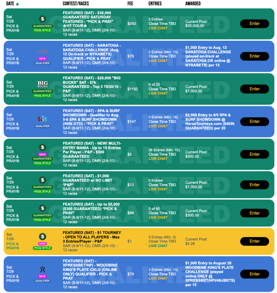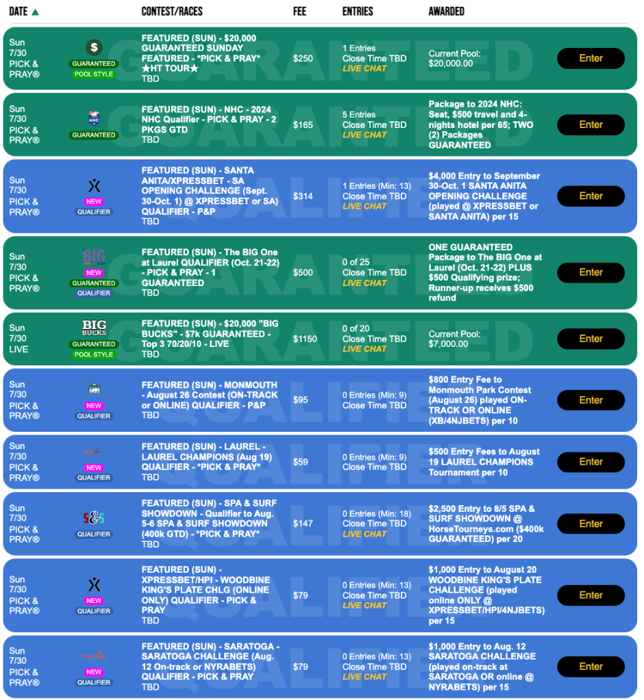 HorseTourneys is the July (30th) place to be for your Sunday chance to qualify for the NHC. We offer a $165, 1-per-65 Pick & Pray. Two seats are guaranteed to be awarded here.