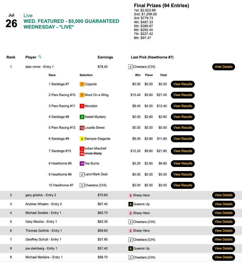 Rorrer had 6-1 Word on a Wing (who wouldn’t like a horse with a name like that?) among his 5 firsts and 1 second to earn $2,923 in Wednesday’s $5,000 Guaranteed tourney, which ended up with a pot of $6,497.