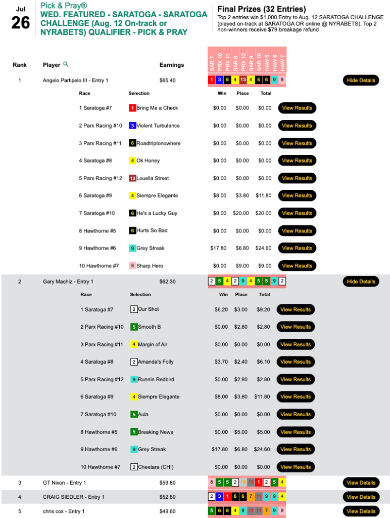 Getting back to Wednesday action, Angelo Partipelo III (2 wins, 2 places, despite blanking on the first five races) and Gary Machiz (4W, 3P) were the $1,000 seat winners in the day’s Saratoga Challenge qualifier.