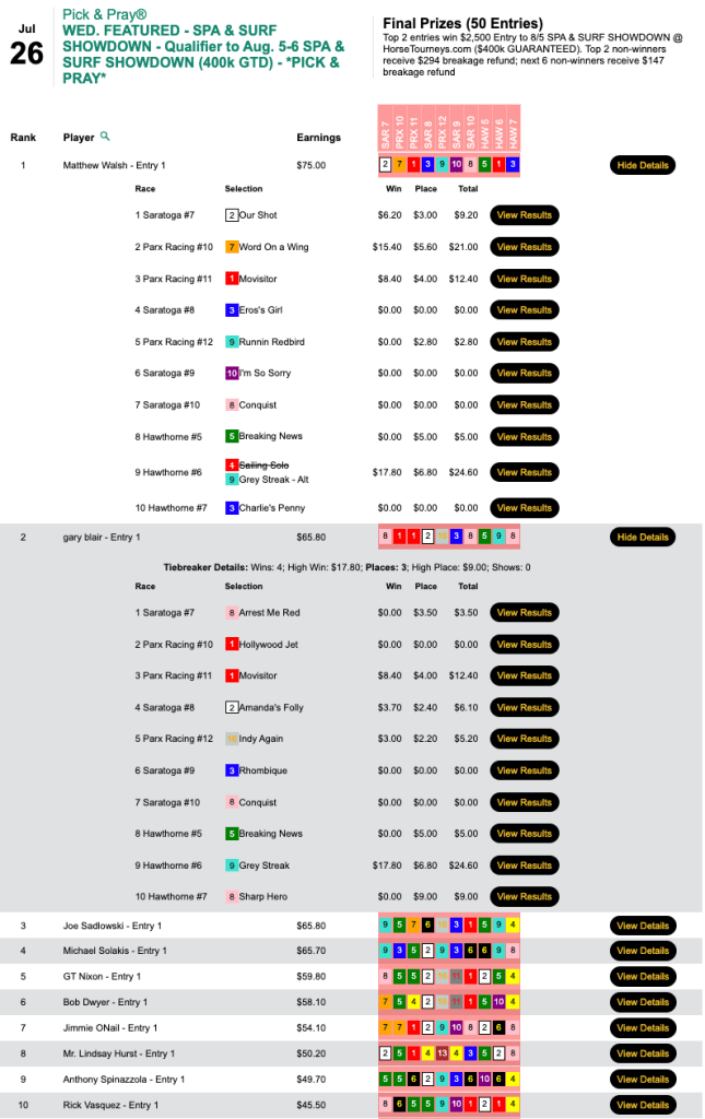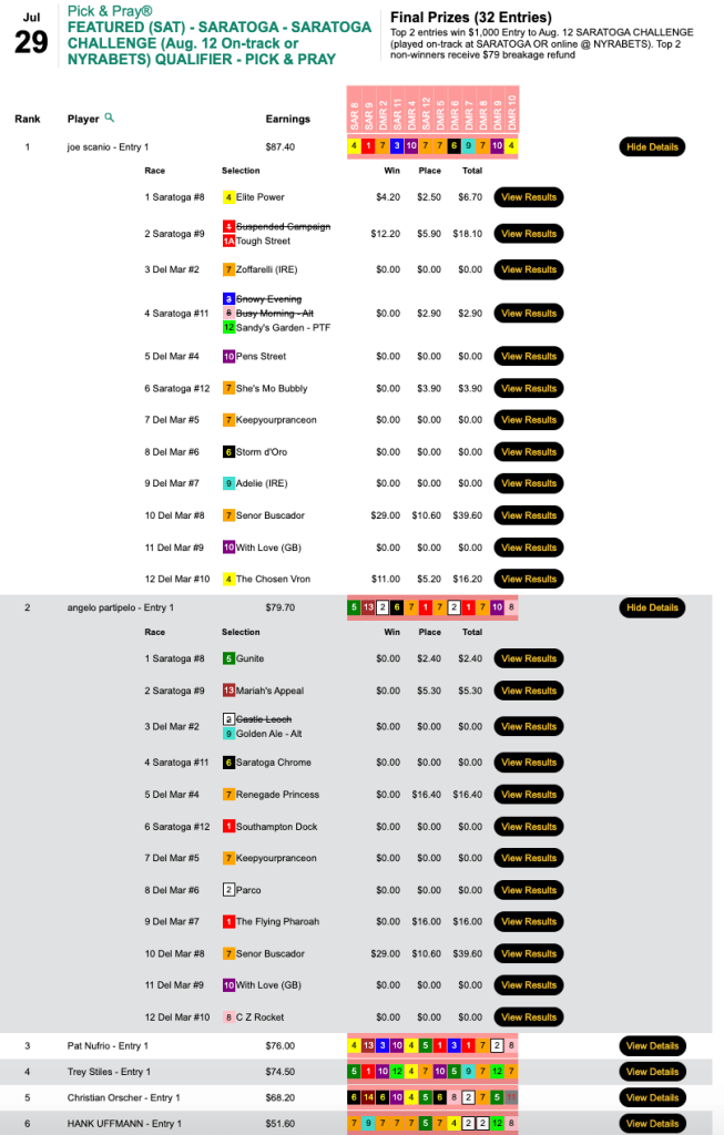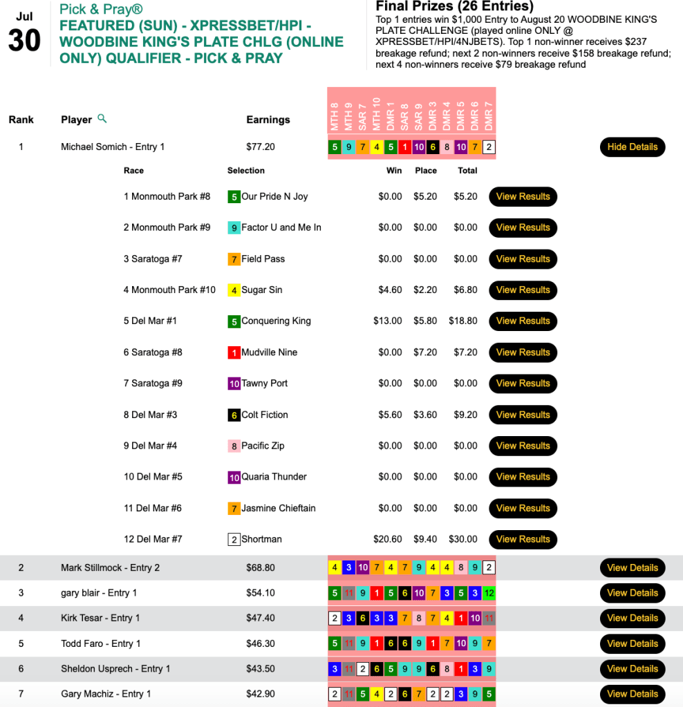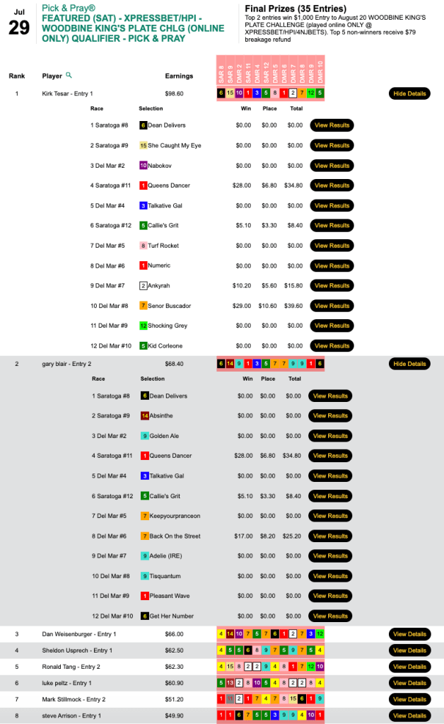 Queens Dancer ($28.00, $6.50 in the 11th at Saratoga) was the greatest common denominator on the scorecards of first-place finisher Kirk Tesar (4 wins, 0 places) and Blair (3W, 0P). They each earned $1,000 berths here for the August 20 Woodbine King’s Plate Challenge (playable at Xpressbet, HPI or 4NJBets).