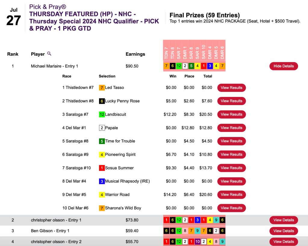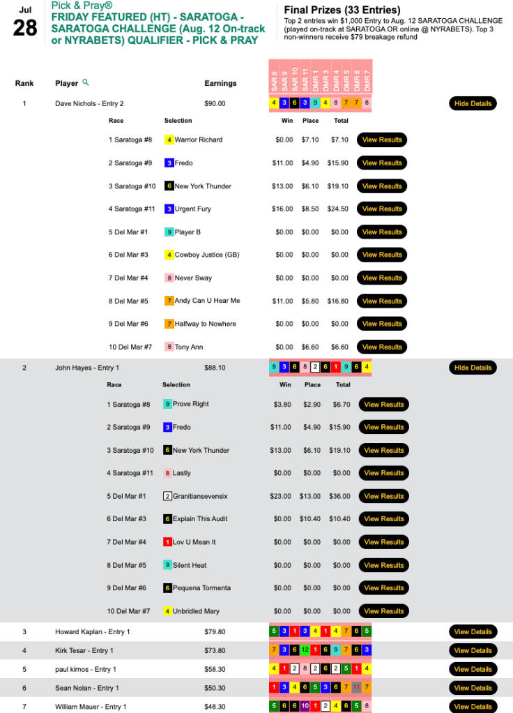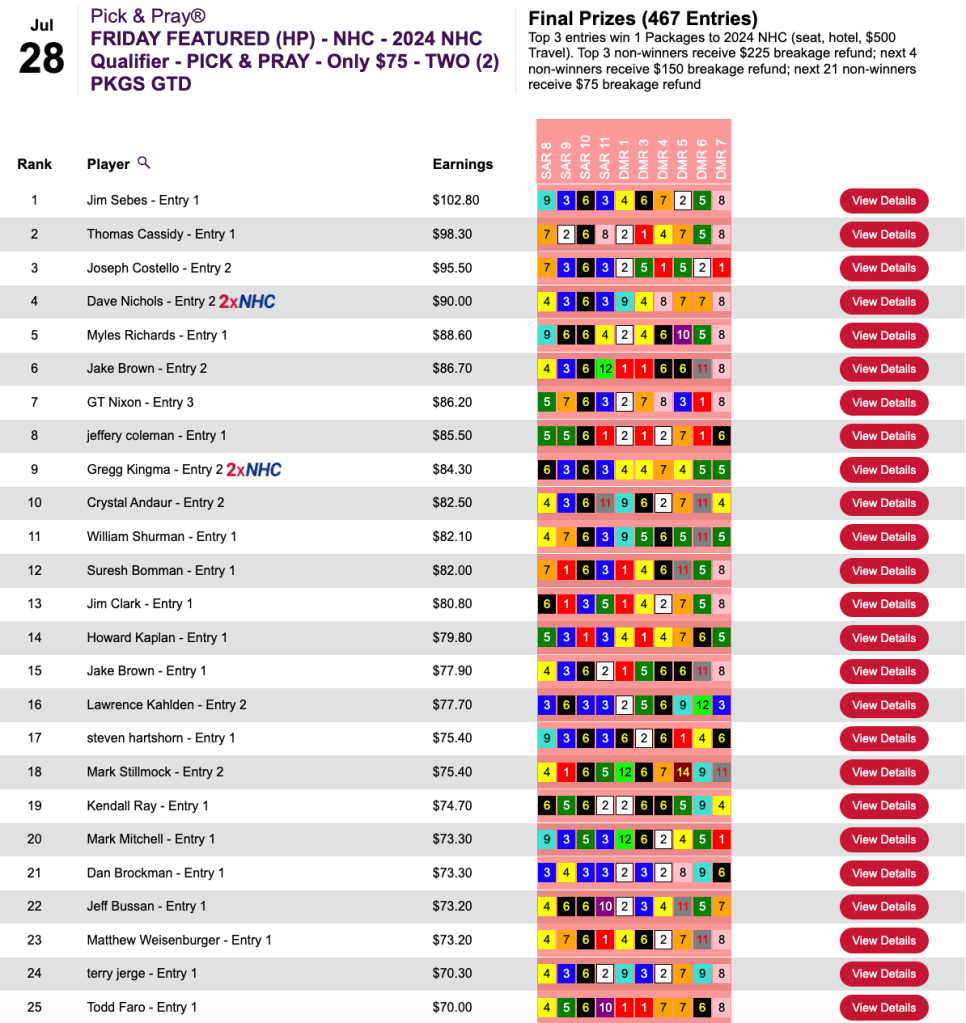 Over at HorsePlayers, Jim Sebes (5 wins, 3 places), Tom Cassidy (5W, 1P) and 2021 NHC Tour champion Joseph “Kevin” Costello (4W, 0P) were the three seat winners in Friday’s $75 NHC Pick & Pray.