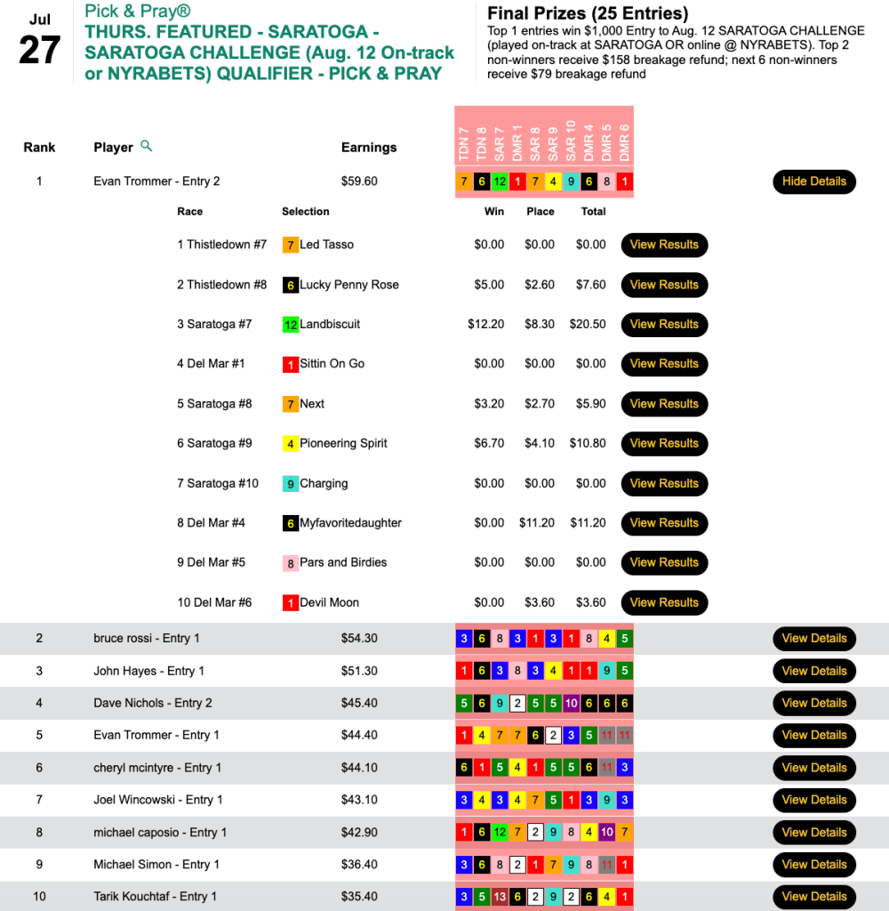 On Thursday, Trommer had 4 winners and 1 double-digit place collection to capture the day’s Saratoga Challenge play-in.