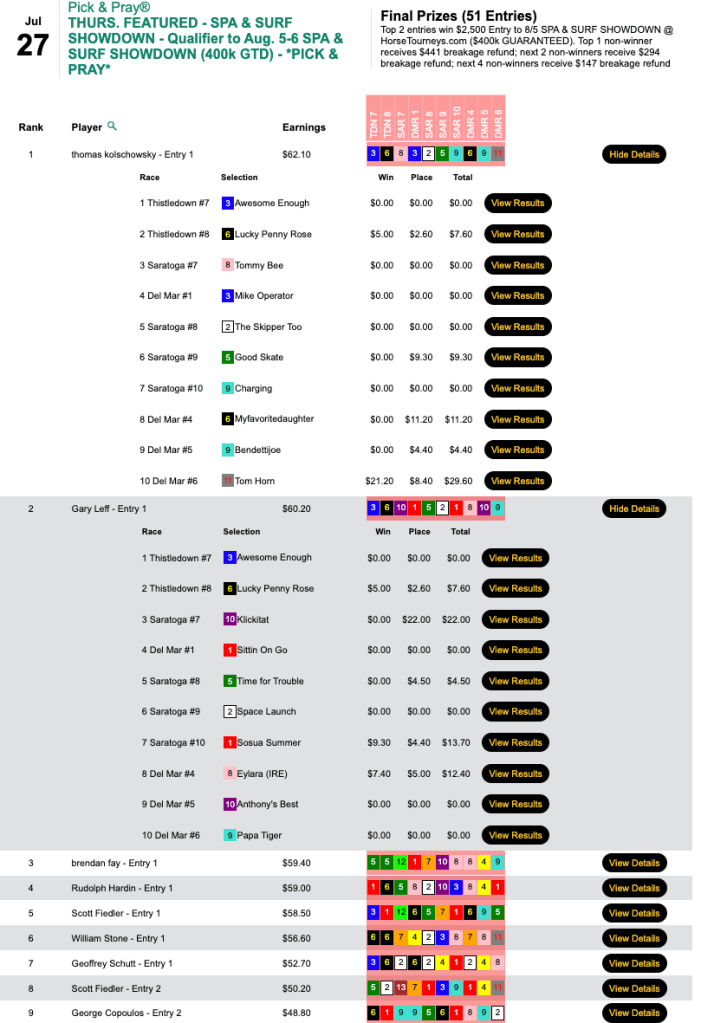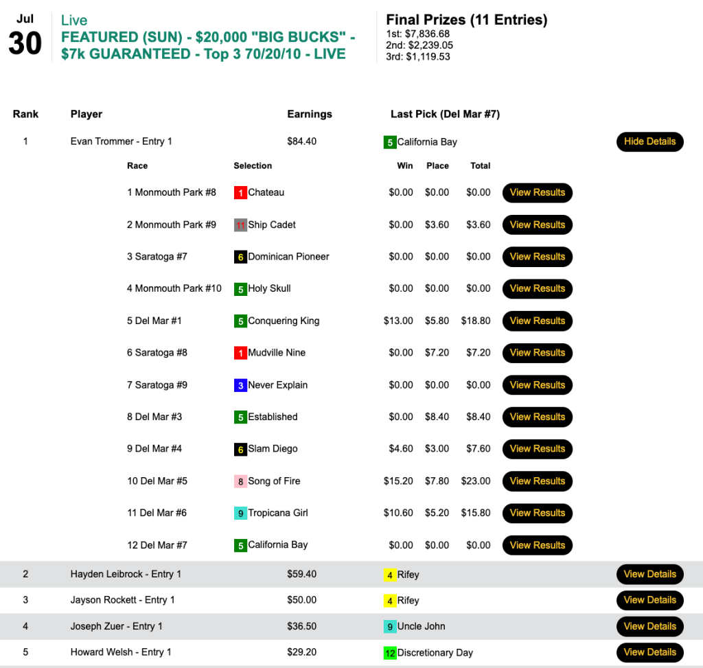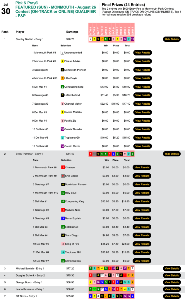 As for Trommer, his lost weekend at Del Mar wound up bringing him $12,636. And despite Trommer now having seats for August 26 (Monmouth) and September 30-October 1 (Santa Anita), the HorseTourneys accounting department is confident that it can still count on his play those days.