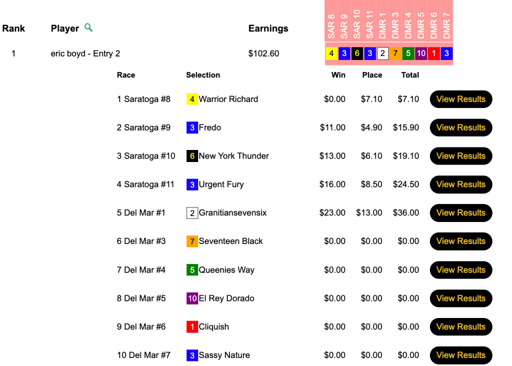 Boyd did all of his scoring over the first 5 contest races, capped off by first-time-starter Granitiansevensix ($23.00, $13.00) in the 1st at Del Mar to win the top prize of $10,024 in Friday’s HT Tour game, our $15,000 Guaranteed Pick & Pray, which finished up with a prize pool of $22,277.