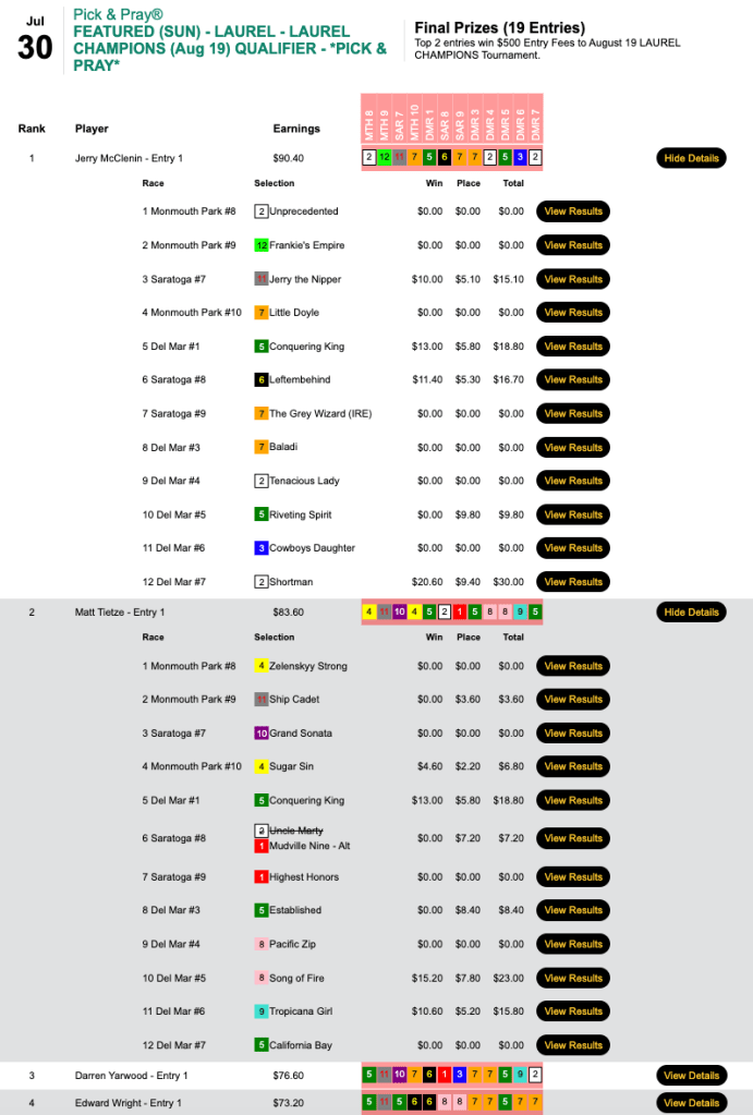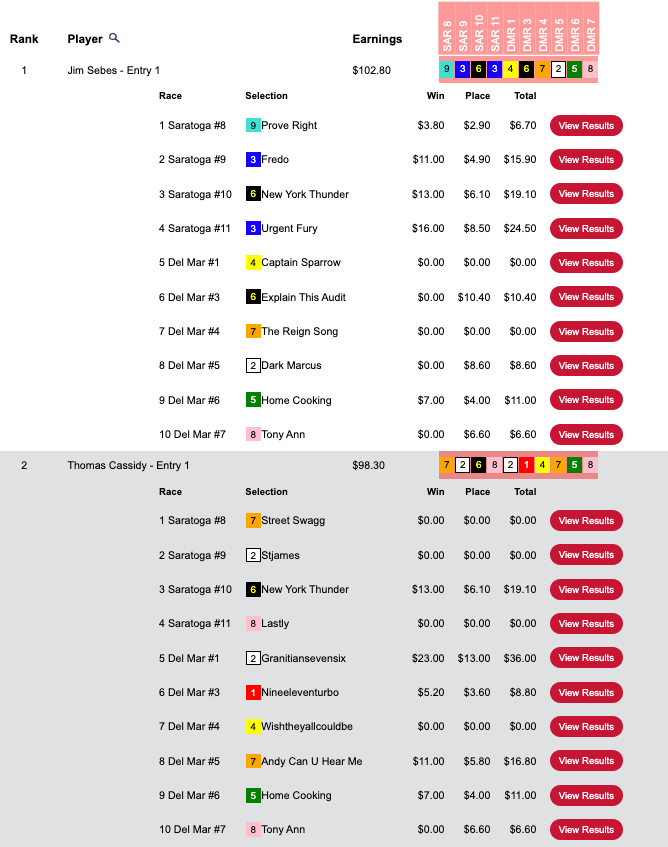 The two winners of $500 seats here were Jerry McClenin (4 wins, 1 place) and Matt “The Fly” Tietze (4W, 3P). McClenin’s big horse was Shortman ($20.60, $9.40) in the 7th at Del Mar. Tietze’s top return came courtesy of Song of Fire ($15.20, $7.80) in race 5 at Del Mar.