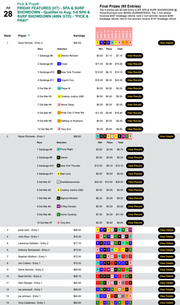 Nichols’s tables accurately predicted that Urgent Fury ($16.00, $8.60) would be a good bet in the 11th at Saratoga. That winner plus 3 others and 2 runners up allowed Nichols to lead the way in Friday’s Spa & Surf Showdown qualifier which also saw Myles Richards (5 wins, 1 place), 2013 BCBC champ Peter Behr (3W, 2P) and John Rice 3W, 1P) land $2,500 seats.