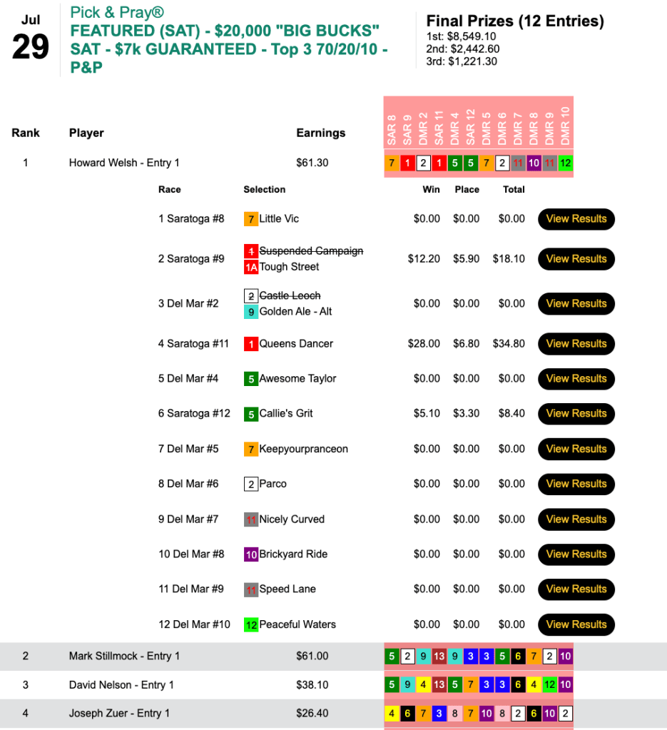 One of Welsh’s 3 winners was Queens Dancer, and that one helped propel Welsh to a triumph worth $8,549 in Saturday’s $10,000 Guaranteed Big Bucks Pick & Pray, which had a final pot of $12,213.