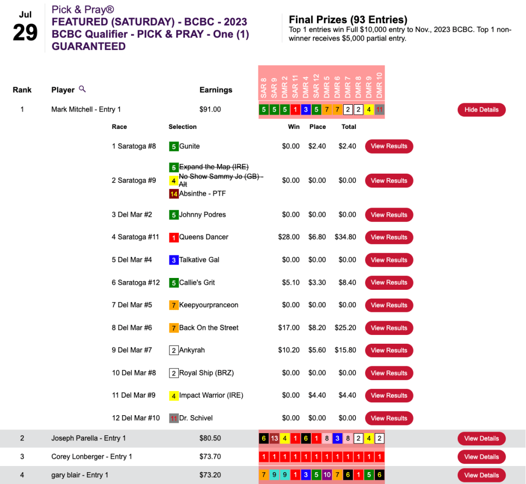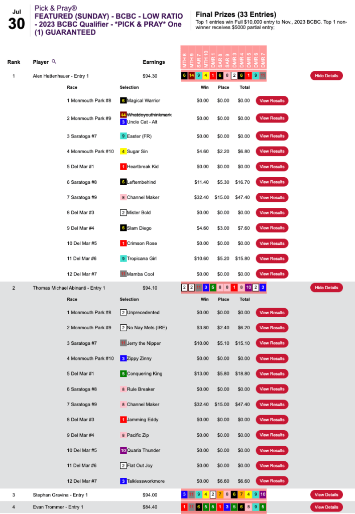 Saturday’s BCBC qualifier at HorsePlayers was a $179 Pick & Pray.