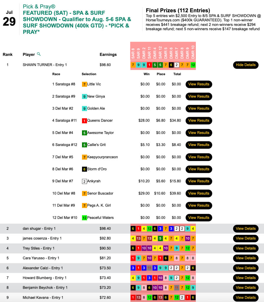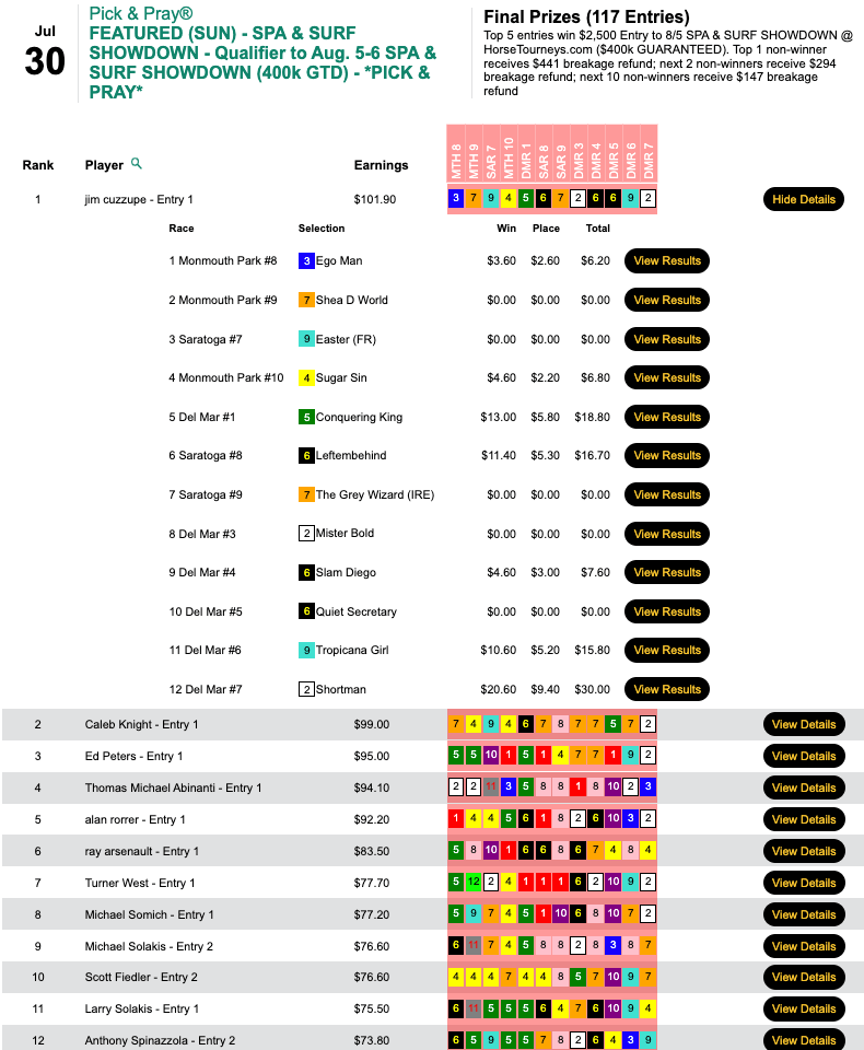 There were five $2,500 seat winners in Sunday’s Spa & Surf qualifier. Also earning places in the $400,000 Guaranteed event were Jim Cuzzupe (7 wins, 0 places), Caleb Knight (3W, 2P), Ed Peters (3W, 4P), Thomas Michael Abinanti (4W, 1P). All but Abinanti had Shortman ($20.60, $9.40) in the final contest race, the 7th at Del Mar.