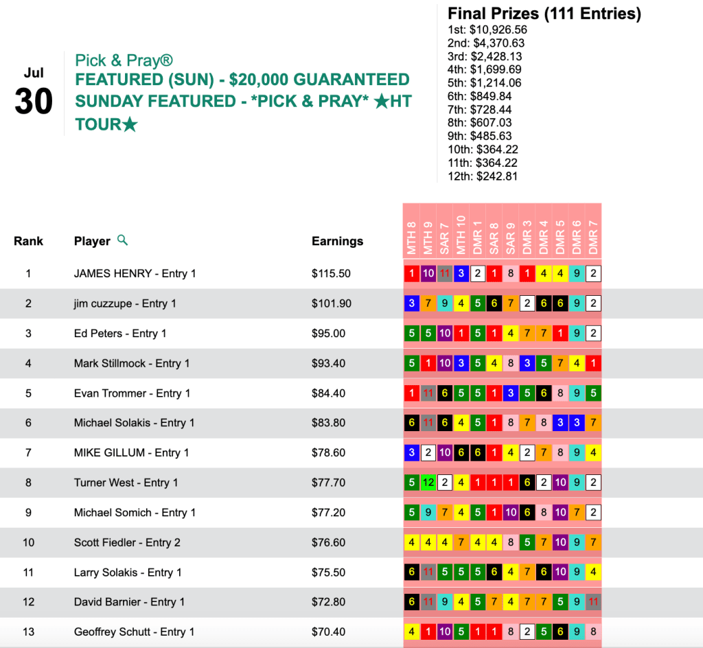 Grutsch picked 4 winners in all, and he made off with the top prize of $15,107 in the week’s richest event (and Saturday’s HT Tour battle), our $30,000 Guaranteed Pick & Pray, which closed its doors with $33,572 in the till.